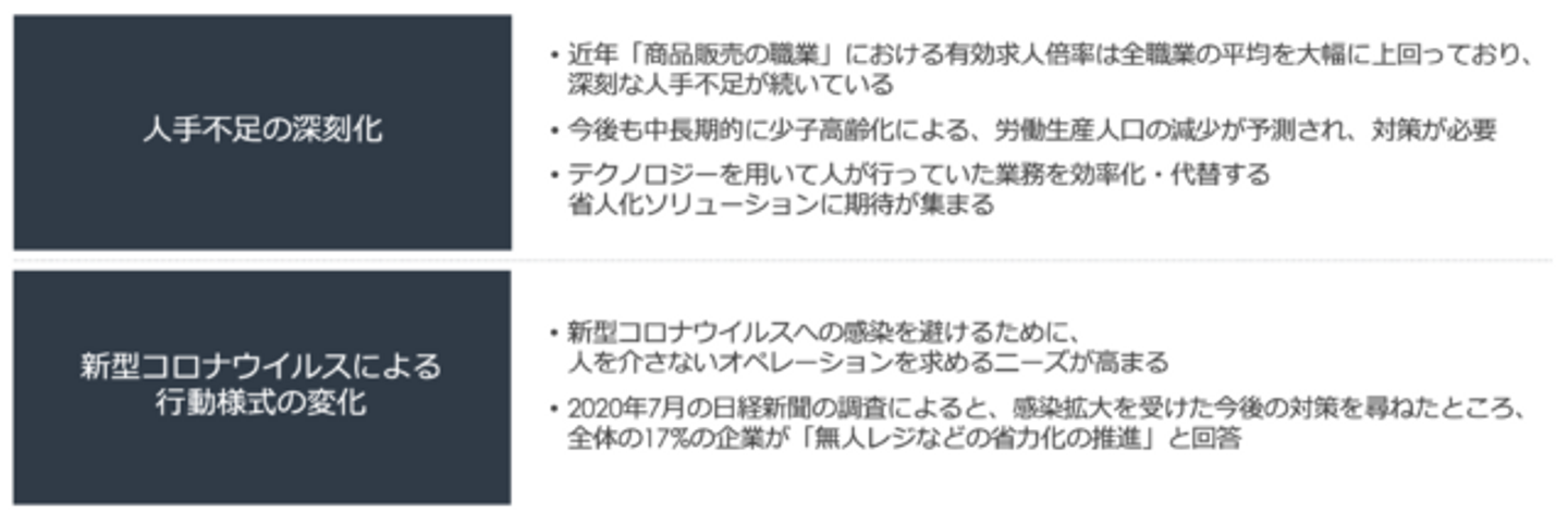 このことは、多くの小売事業者が省人化ソリューションの導入を検討する契機となりました。