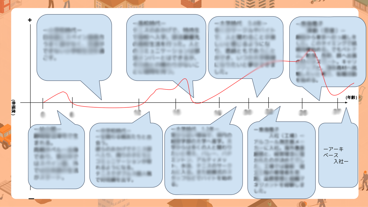 - 既存社員が新しくアーキベースに入社した人の生い立ち(人生曲線)を知ることで、新入社員の理解を深めてもらう