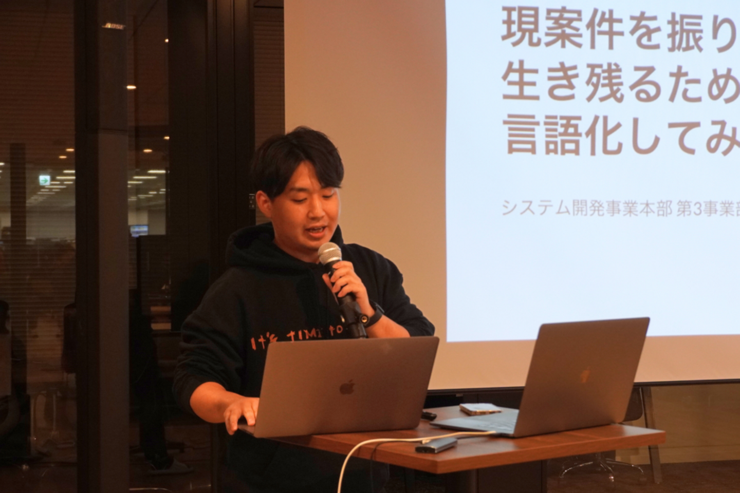 最後に登壇したのは、サーバーサイドエンジニアとして活躍中の椋本さん!今回のタイトルは「現案件を振り返り、継続案件になっている理由を考えて言語化してみた」。受託開発ならではの仕事術について、熱意たっぷりに語ってくれました。