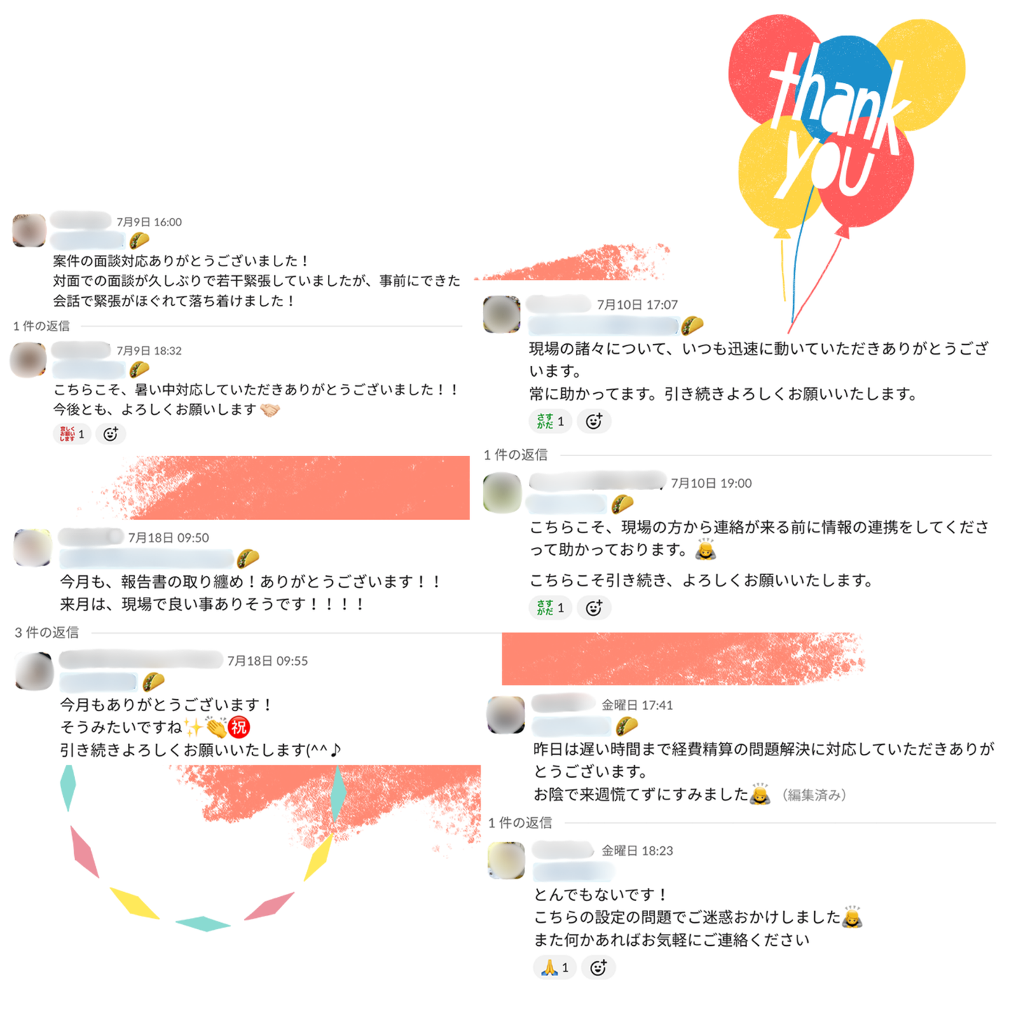 日々の業務や様々な物事に対する感謝の気持ちを伝え合うことで、社員同士が日常的にしっかりとコミュニケーションを図っています。