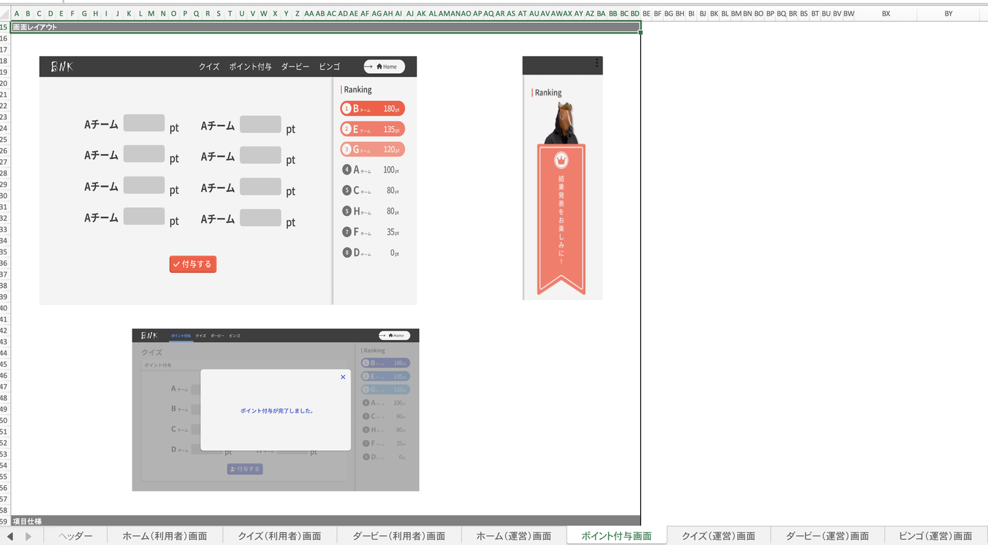 ↑この画面は各企画で各グループが獲得したポイントを実際に付与する管理側の画面設計書です。設計書にはしっかりとアクションフローや各項目の仕様まで掲載されています。