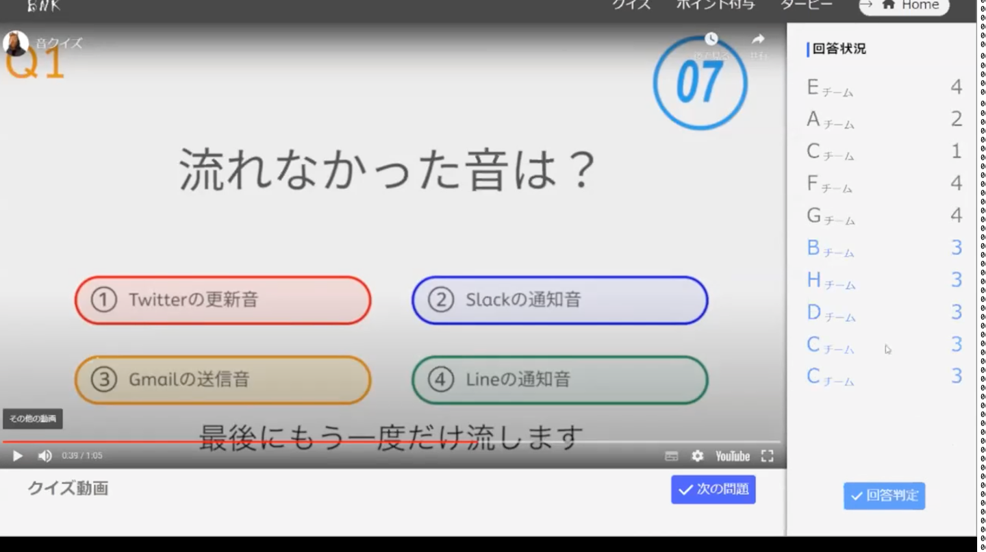 解答判定のボタンを押すと各グループから送られてきた回答が発表され正解グループは青く光る仕組みになっています👏
