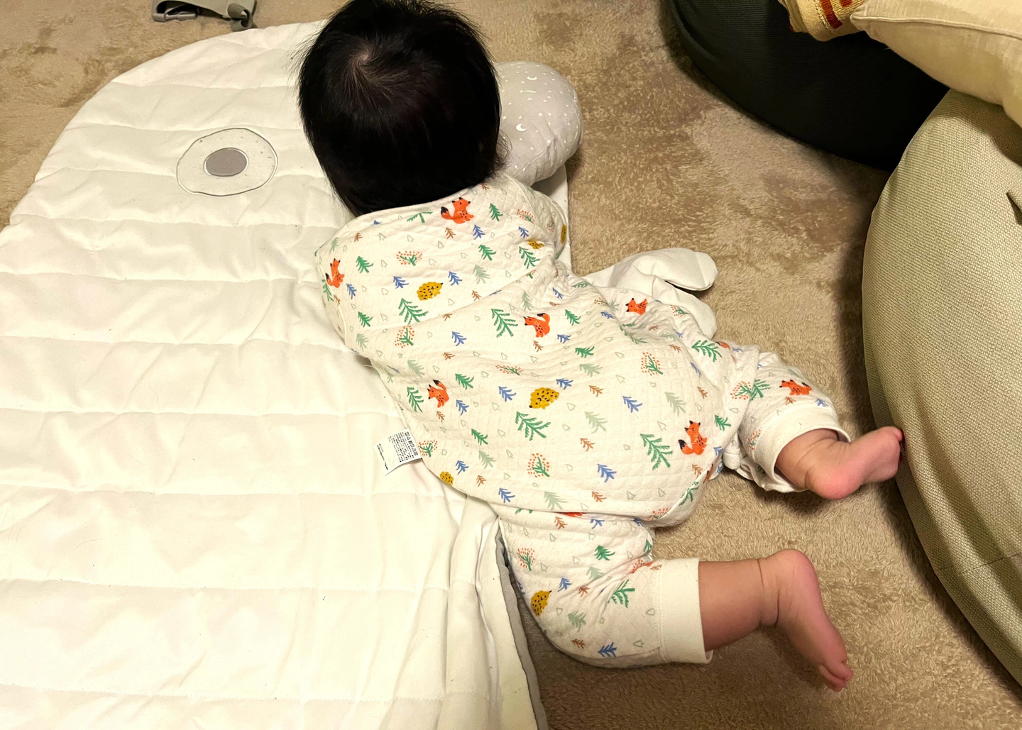 寝返りをしたがっている動きは見せていたんですが、あと一歩のところで出来ず…というプロセスから見守っていたので、余計に感動しました。