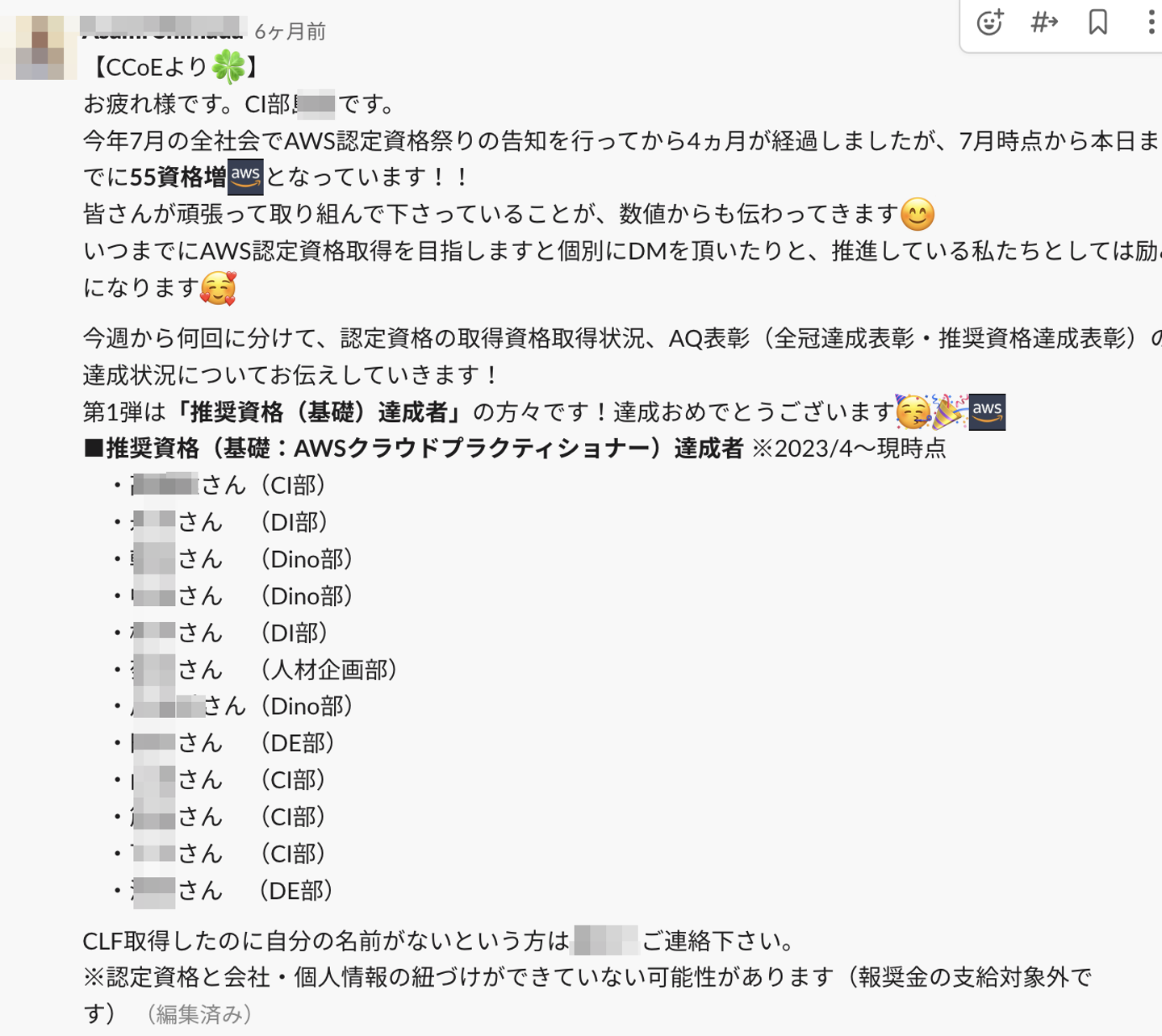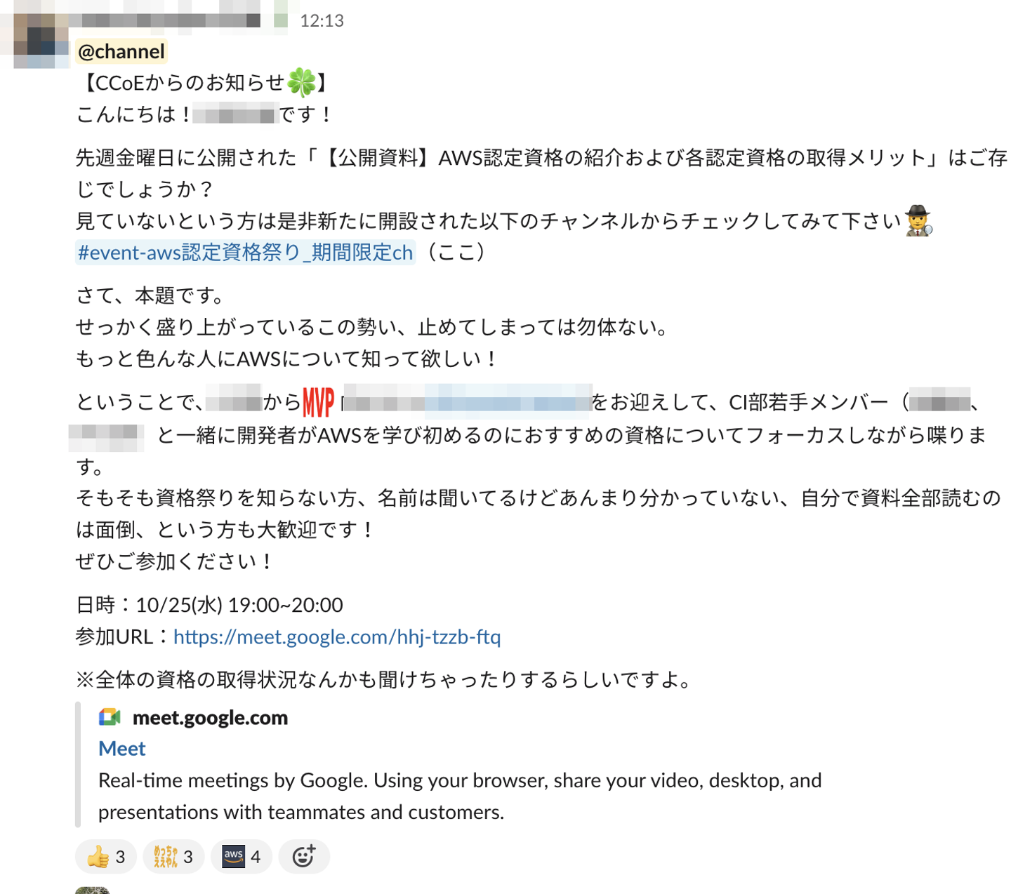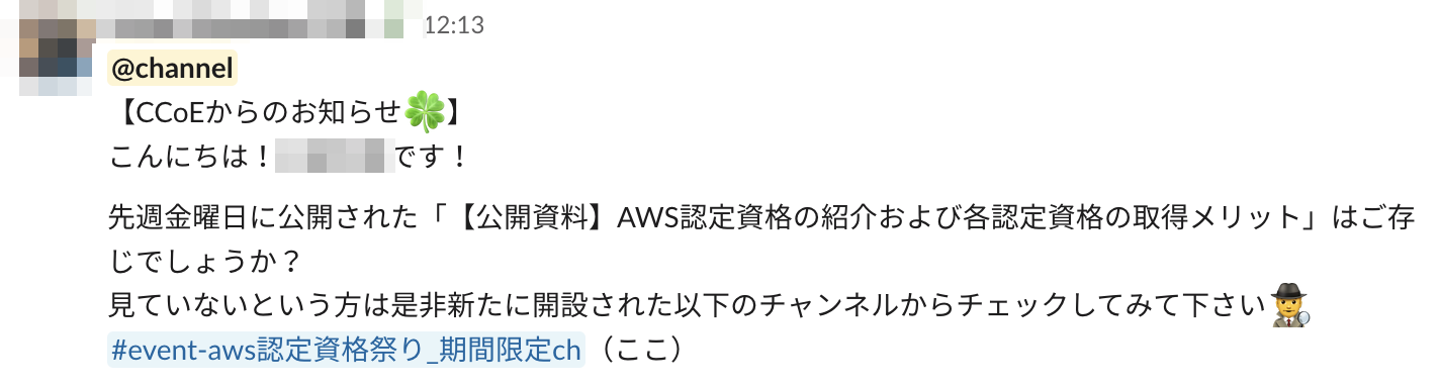 社内のSlackではイベント専用チャンネルが立ち上がり、すでに資格を保有している社員やCCoEのメンバーが