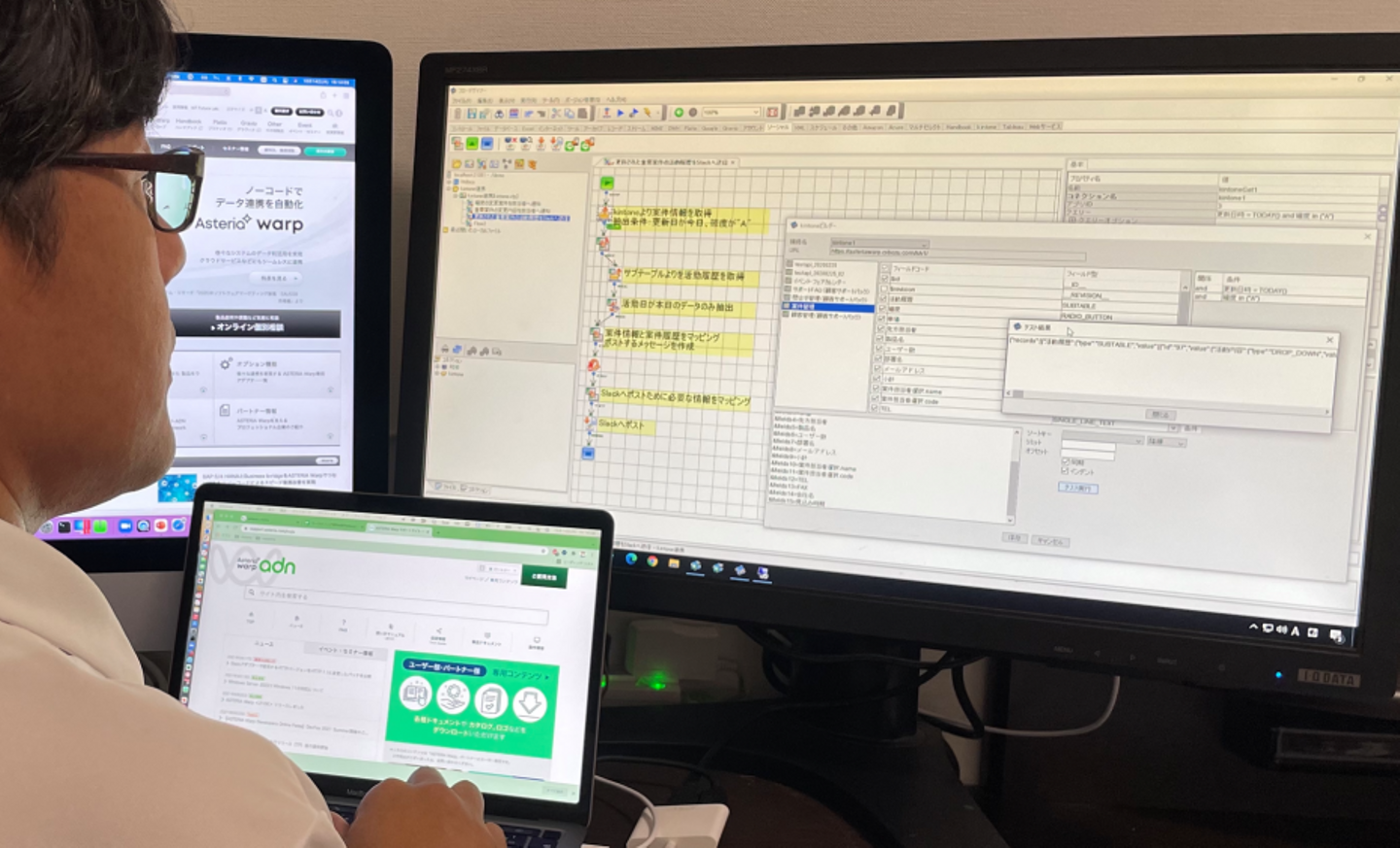 『ASTERIA Warp』は、異なるコンピューターシステムのデータを、ノーコードで連携できるASTERIA Warpを主力製品とするミドルウェアです。メインフレームやクラウド上のサーバーから表計算ソフトまで、様々なシステム間の接続とデータの変換を行うロジックを複雑なプログラミングなしで行えることが評価されています。(ASTERIA Warp 公式サイト www.asteria.com/jp/warp/ )