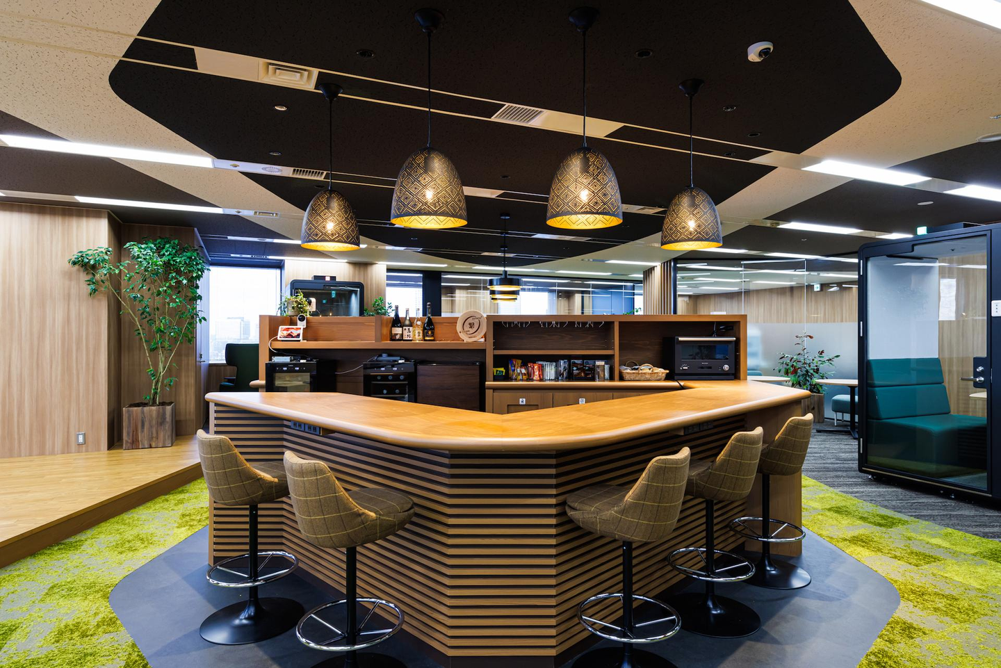 さて、最後にご紹介しておきたいのは、オフィスの真ん中で一際目を引くバーカウンター。来社した誰もが、入った瞬間に「オフィスにバー!?」と驚く空間です。