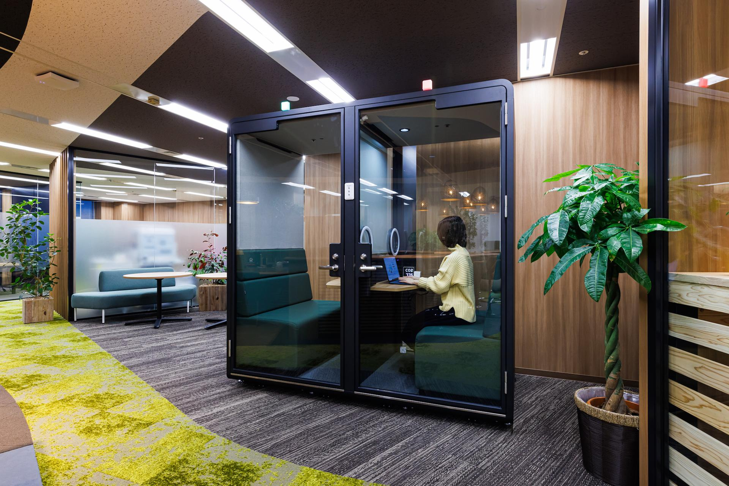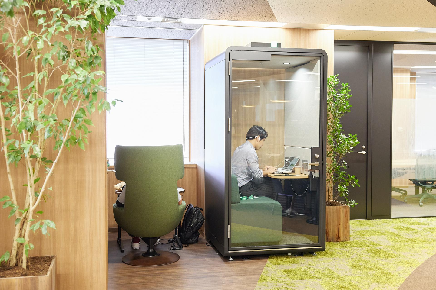 1人用の椅子、テーブル席、カウンター席のほか、「ワークポッド」と呼ばれる個室も。オンラインでの打ち合わせを行うときや、集中して作業するときに重宝するスペースです。