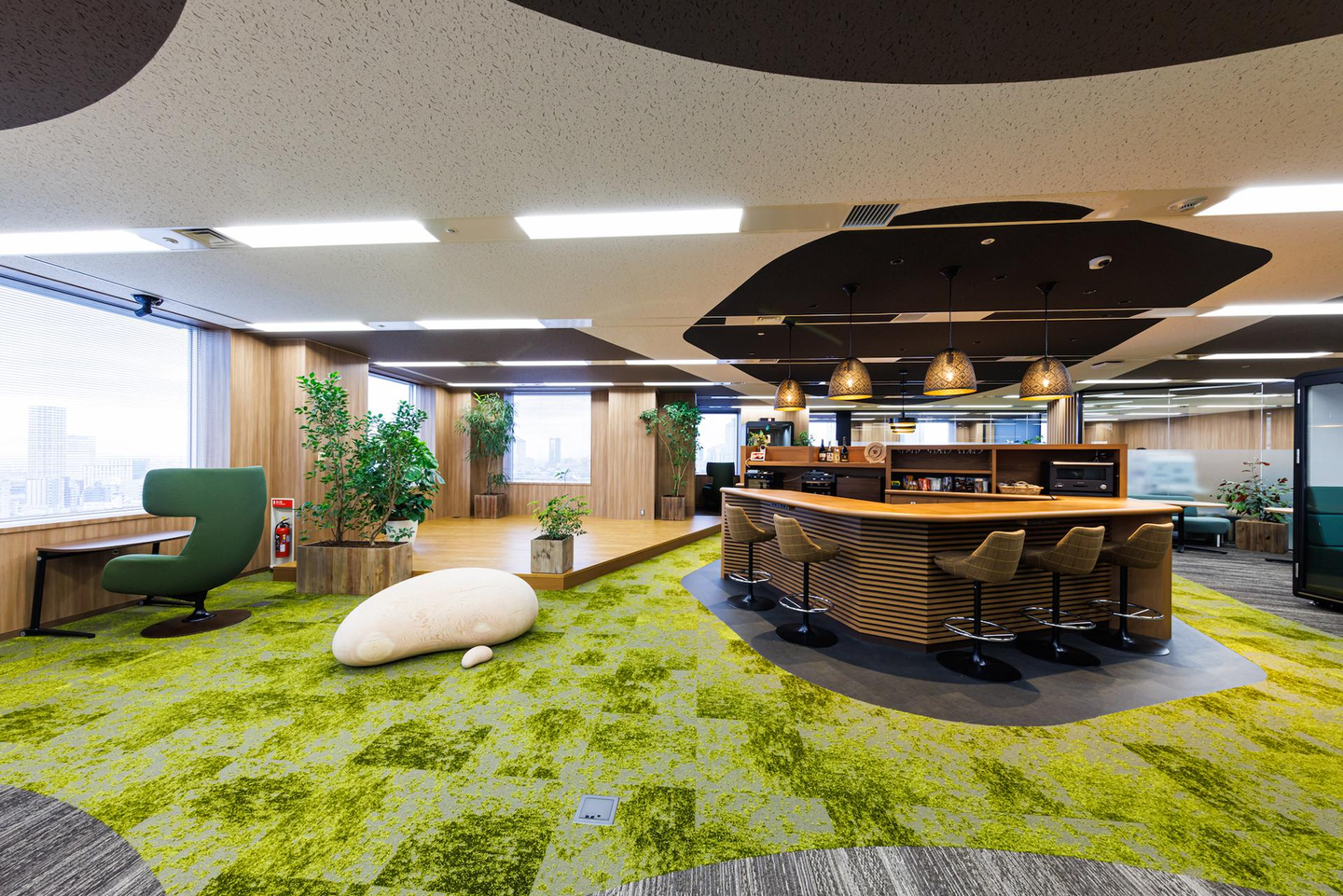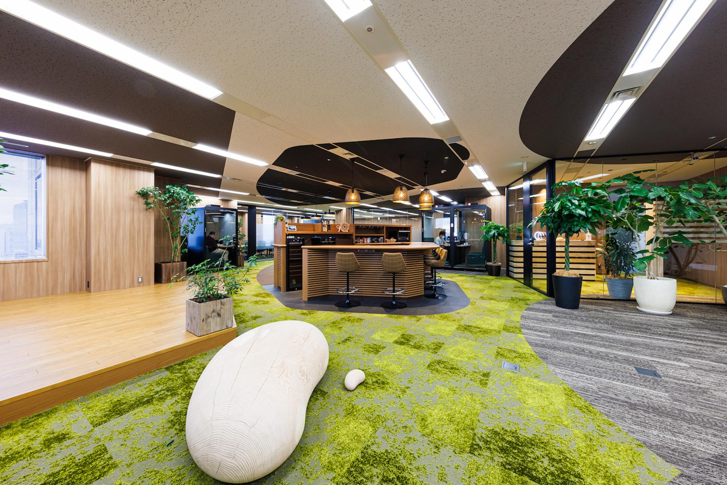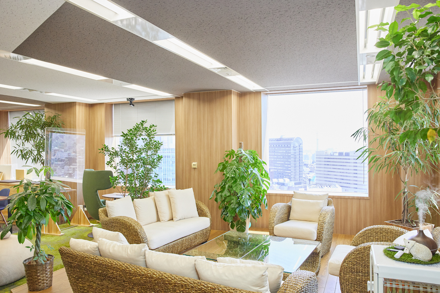 そのコンセプトに沿って作られたセンターオフィスは、熊本県小国町産「小国杉」の間伐材を約100本使用! 木材特有のほっこりとした温かみを感じられるだけではなく、企業活動を通して消費する電力を小国杉によってカーボンオフセットすることで脱炭素の推進も図っています。