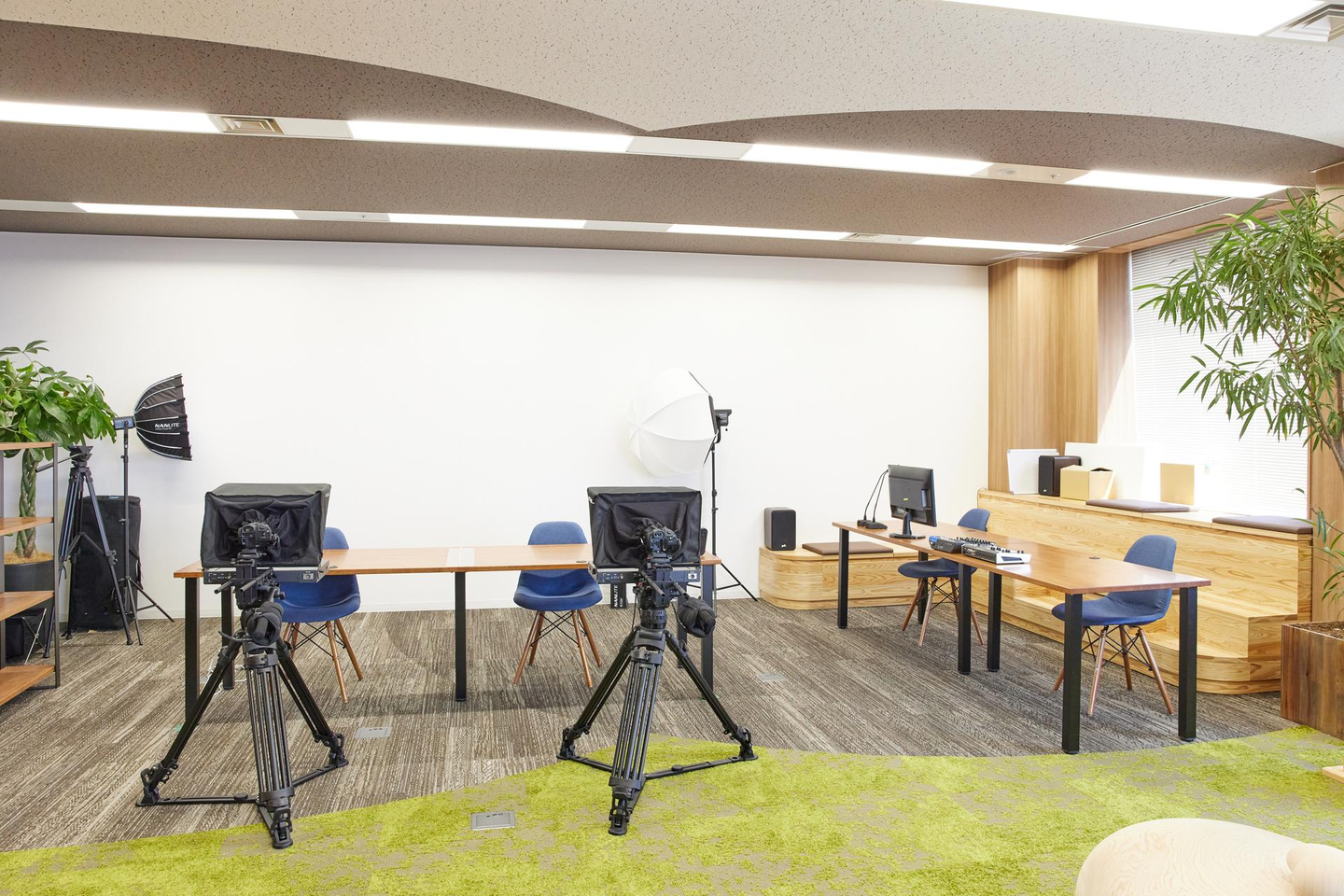 アステリアオフィスの重要な機能として欠かせないのが、タイムリーな動画配信ができるオープンなスタジオスペースです。個人投資家向けの説明会や決算説明会など、YouTube Liveなどを活用した動画配信やオンラインイベントに力を入れてきたアステリアは、前社屋の頃から、自社での動画配信&スタジオ機材にこだわってきました。