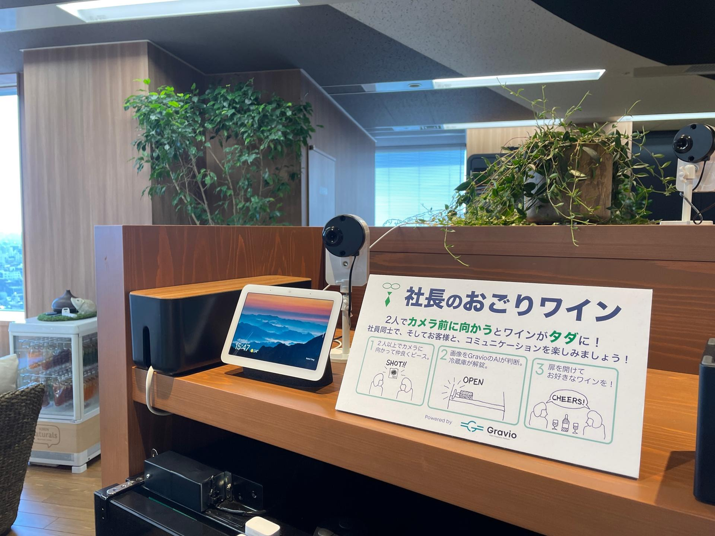 前オフィスで設置されて大好評だったワインセラーを新オフィスにも設置したのですが、こちらにもちょっとした仕掛けが。普段は施錠されているのですが、設置されたIoTカメラで2人の人を検知すると、ワインセラーが自動的に解錠されるようになっているのです! その名も「社長のおごりワイン」。