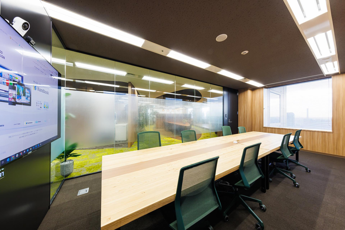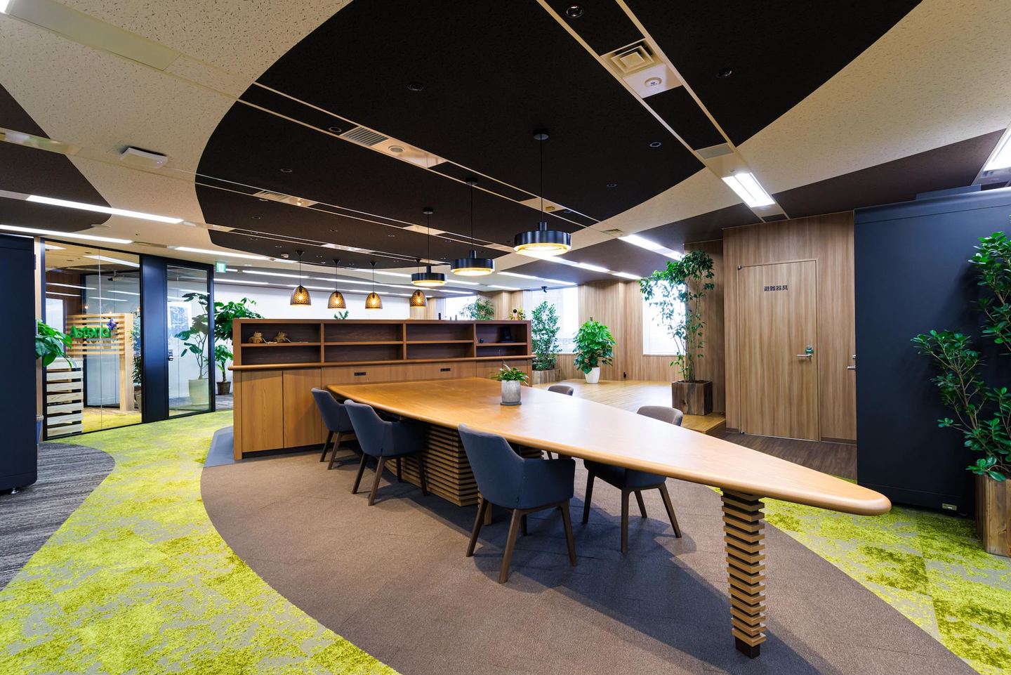 さらにオフィスの奥には、自由に使えるデスクのスペースや複合機、そして大きめの会議室も用意されています。こちらの大きなテーブルにも、美しい小国杉が使われていますよ。