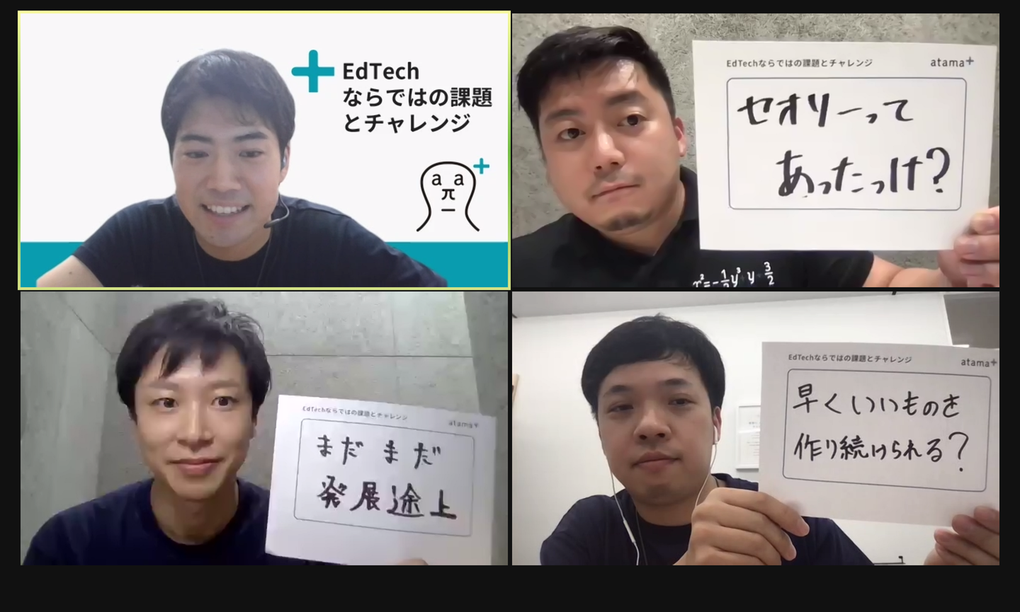 前半では、「atama+ならではの強みやチャレンジ」「atama+をつくる上で大切にしていること」といったテーマでパネルディスカッションを行いました。後半では、視聴者からの質問を受け、具体的なプロダクト改善の方法や、組織が拡大するatama plusでのものづくりについてお話しました。