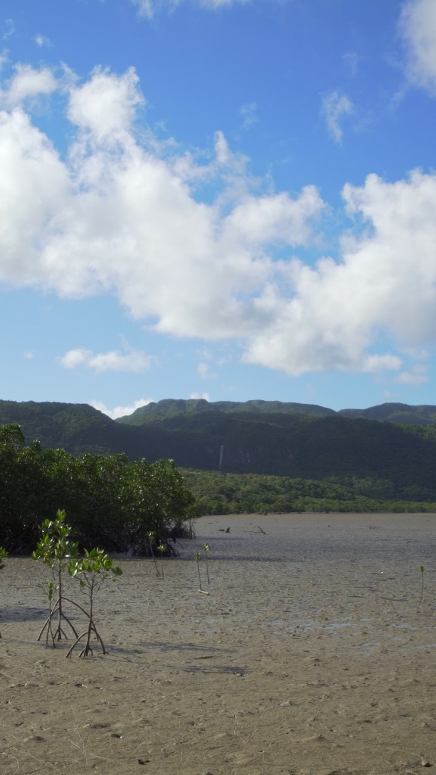 この風景は、西表島の北西に位置する船浦湾を撮影したものです。潮が引いた干潟に根を下ろすマングローブが主役の一つですが、私の目を惹きつけたのは、奥の方に見える山の中腹から流れ落ちる真っ白な一筋の滝でした。
