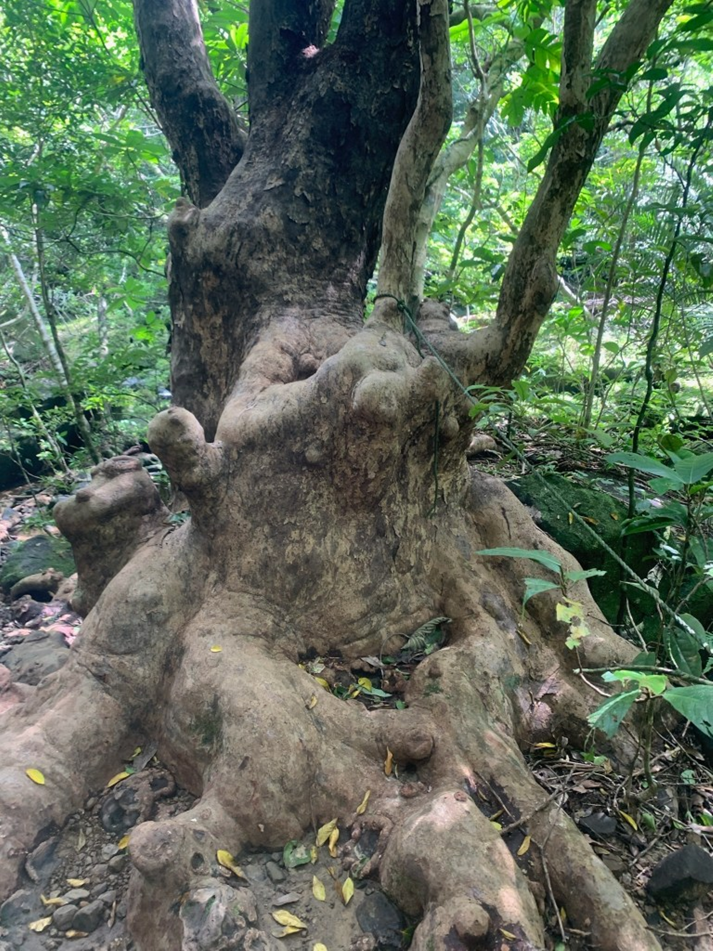 道中に出会えた生き物は、沢の岩陰に潜むテナガエビに、木の幹を走るサキシマキノボリトカゲ。M君がトカゲを捕まえて、私たちの手に順番に乗せてくれました。植物では、大きな板根を張るサキシマスオウノキや、赤い血のような樹液を出すアカギが印象的でした。