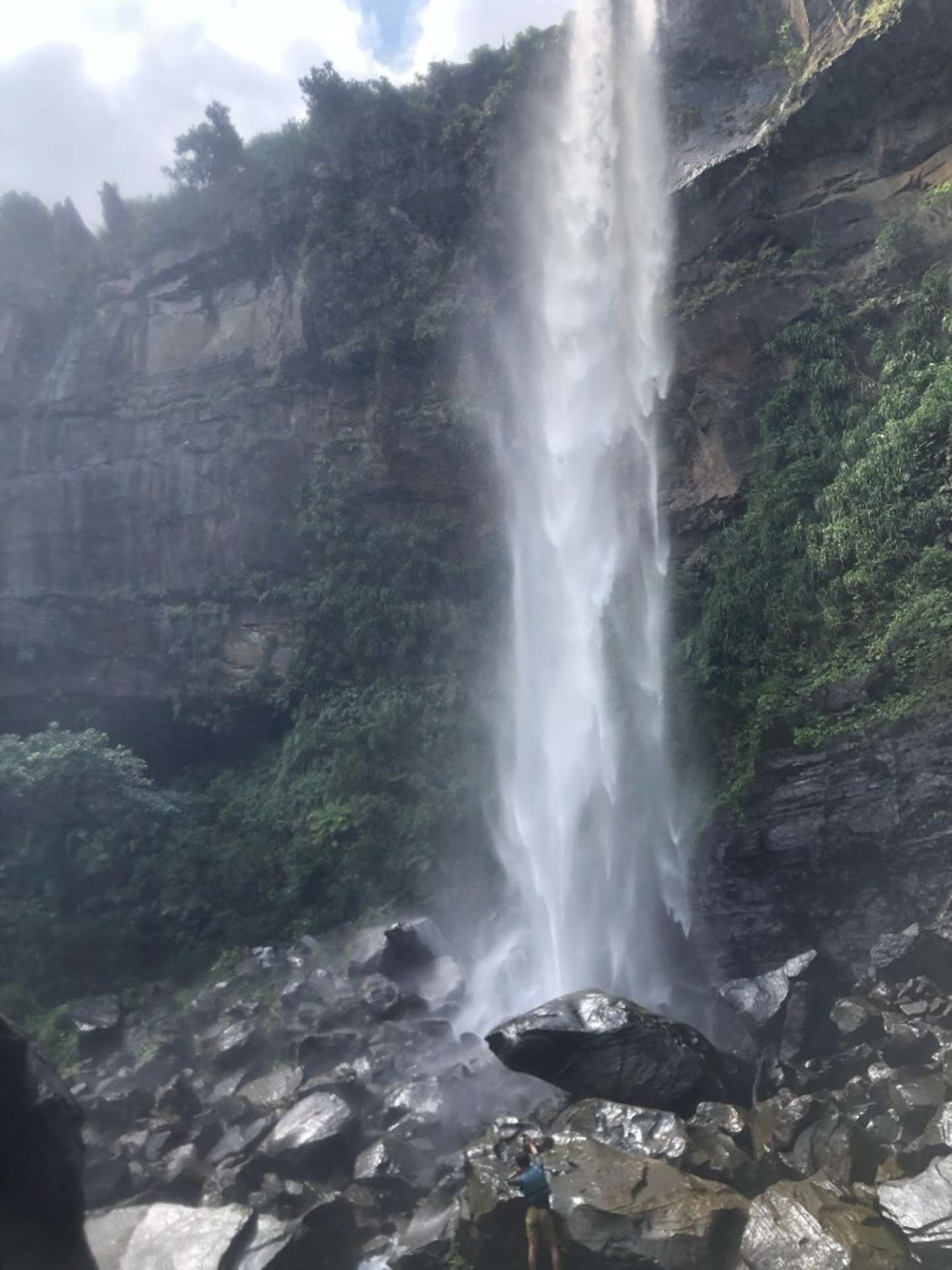 ジャングルを登ること約20分、遠くから滝の水音が聞こえてきました。しばらく歩くと急に視界が広がり、目に飛び込んできたのはもの凄い勢いで流れ落ちてくる水!これほど迫力ある滝を間近で見たのは初めてかもしれません。M君によれば、ここまで水量が多いのは久しぶりとのこと。直前に通過した台風の影響なのでしょう。滝壺に溜まる水もM君がびっくりするほど多く、普段は見えている岩の多くが水に沈んでいるようでした。