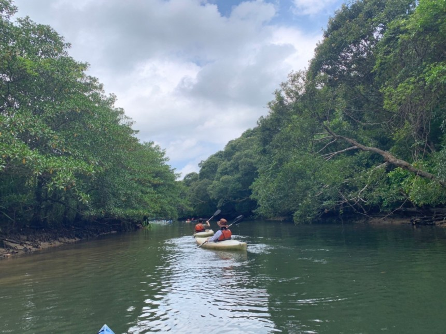 マーレ川は狭く曲がりくねっていて、すぐ両側にはマングローブ林が迫ります。水辺に幾重にもマングローブの根が張っていて、その奥は暗い闇のよう。その中に隠された生き物たちの世界を想像しながら、船浦湾の裏を過ぎ、ヒナイ川に入って、船着場まで漕ぎ進みました。時間にすると30分くらいだったでしょうか、自然を独り占めしたような気分になれる最高の時間でした。