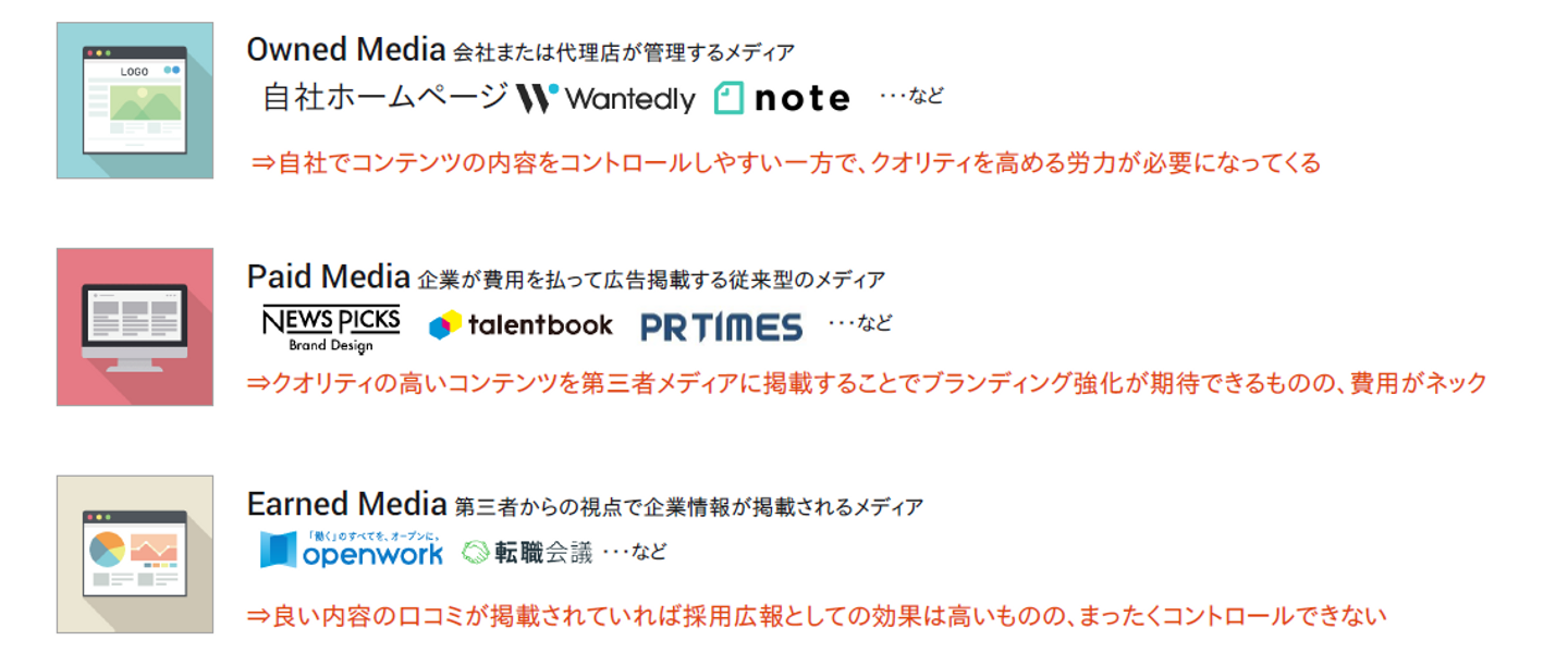 現在は売り手市場を背景に、オウンドメディアに加えて、noteやWantedlyといった媒体からの発信、またSNS、動画を利用して、企業の文化や社員の働き方を等身大に伝える手法が広まっています。