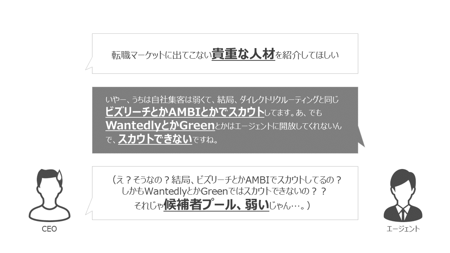 さらにスタートアップ/ベンチャー企業の採用マーケットで考えると、多くの企業が利用しているWantedlyやGreenはエージェントにデータベースを開放しておらず、企業のみダイレクトにアプローチすることが可能となっています。