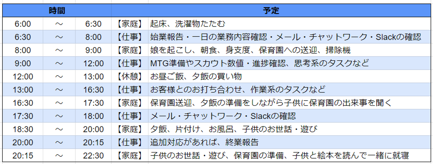 毎日朝6時に起床し、家事や身支度のルーティーンを済ませてすぐに始業します。子どもや夫が起きる前にやり切ろうという思いで取り組むと、仕事が捗ります(笑)。その後、保育園の送迎や家事などを間に挟みながら、18時に基本的な業務は終了です。20時から15分程度、追加で対応することもありますが、メッセージの確認などにとどめています。