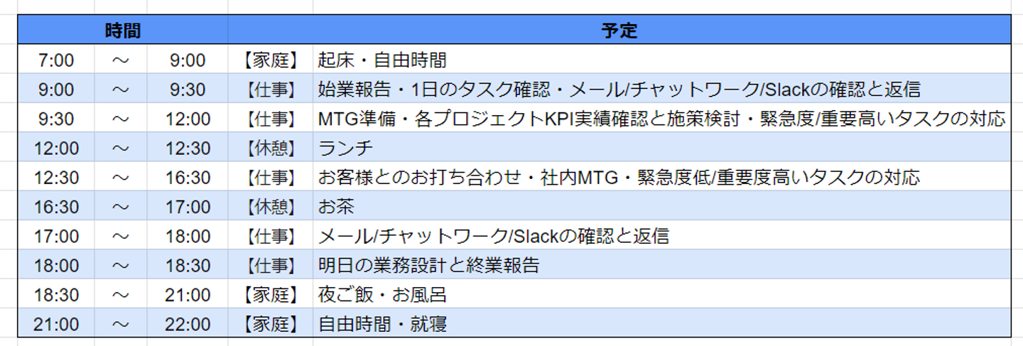 続けていくには問題だと感じて、働き方を見直すことにしました。まずは、項目ごとにタスクを洗い出し、処理にかかった時間を全部書き出してみることにしました。視覚から客観的に業務全体を把握して、それをもとに予定を組みを立てるようにしたところ、徐々に自分に合ったスケジュールがわかってくるようになりました。一番高くパフォーマンスを出せるペース配分が掴めるようになり、あの時見直してよかったと思っています。