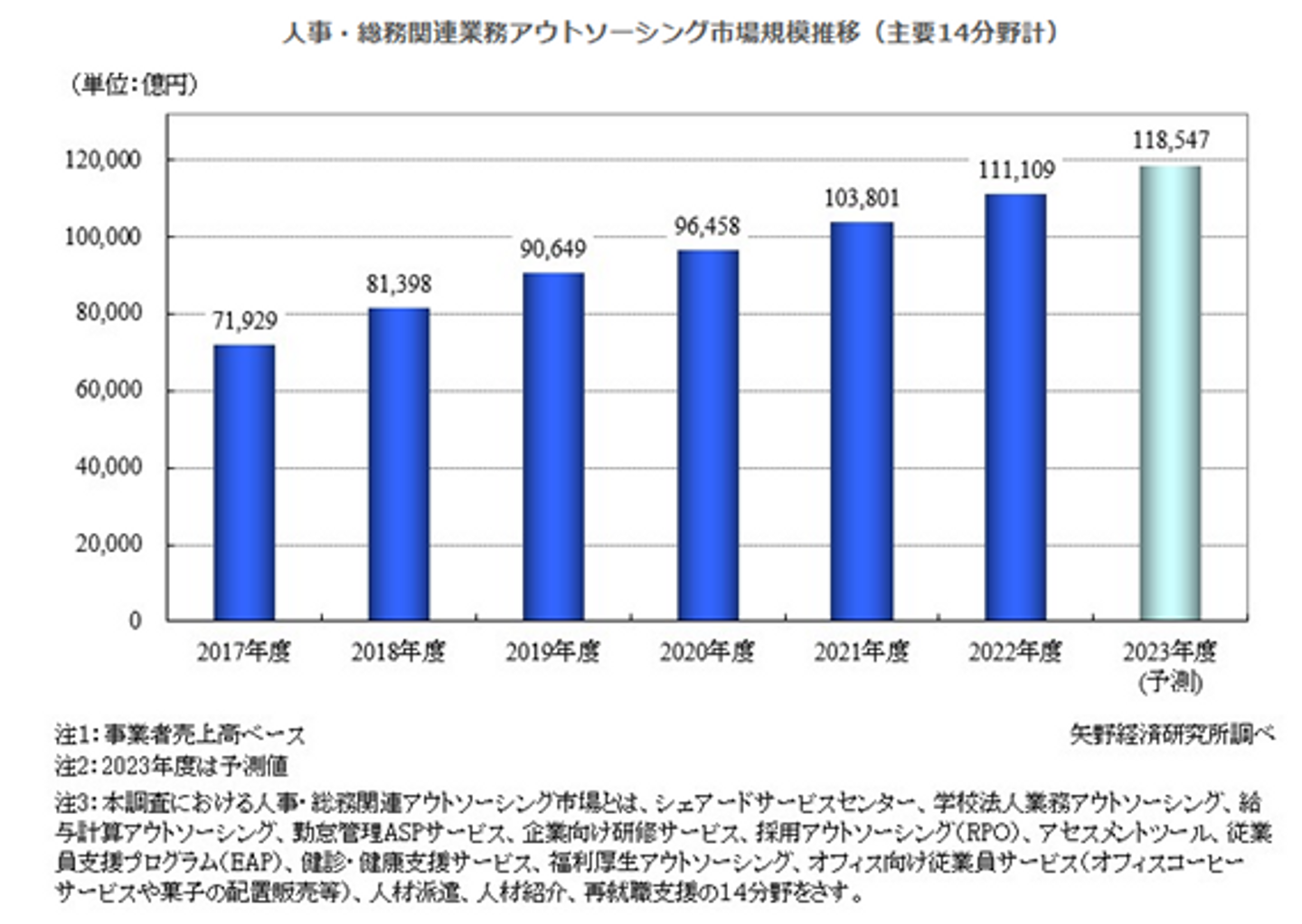 社内のリソース不足を解消して採用活動の効率化やコスト削減につながり、働き方改革や人的資本経営の推進が可能となることから注目され、年々市場規模が拡大しています。(※RPOを含む、人事・総務関連業務アウトソーシング市場全体で拡大傾向にあります)