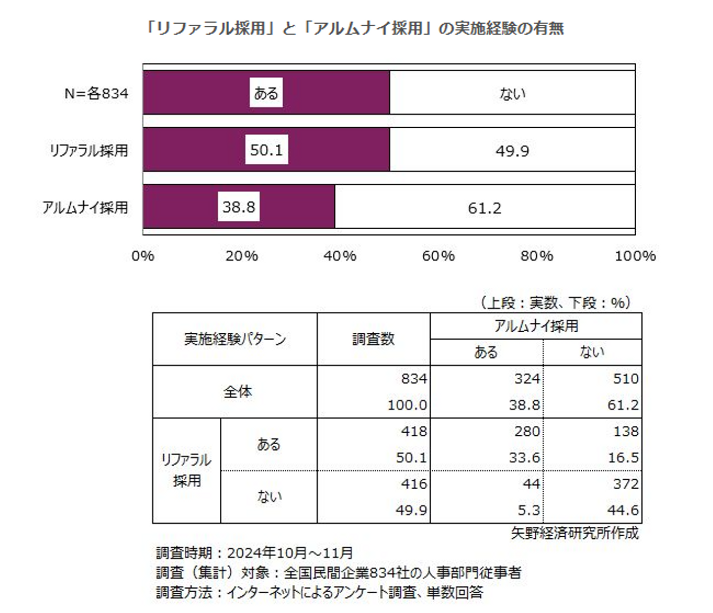 2024年度のリファラル・アルムナイ採用の市場規模は、前年度比169%増の50億7,000万円に拡大しており、「アルムナイ採用経験あり」の企業は38.8%であることが明らかになっています。