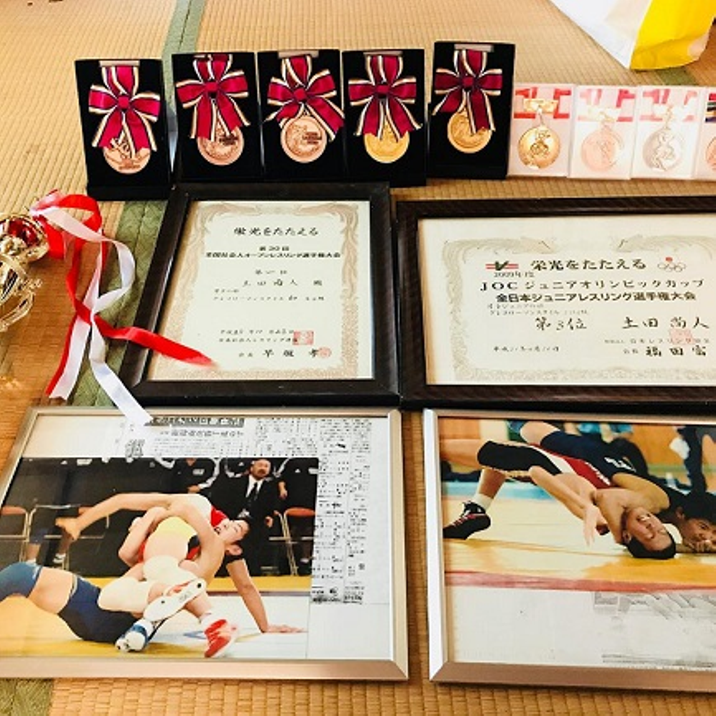 (レスリングの大会で圡田さんが受けてきた数々の表彰)