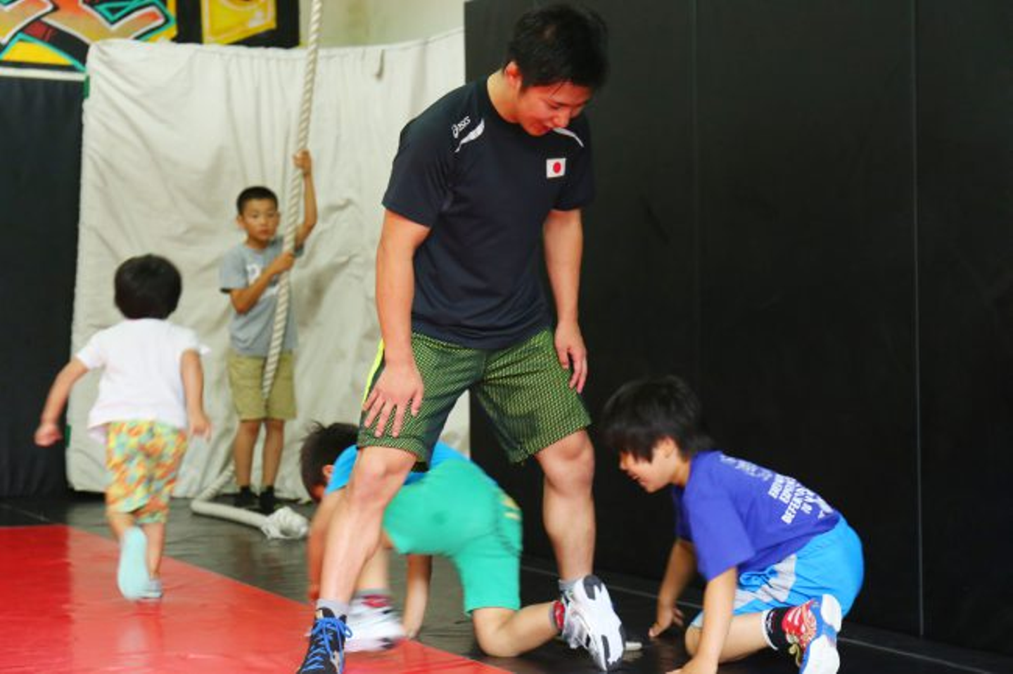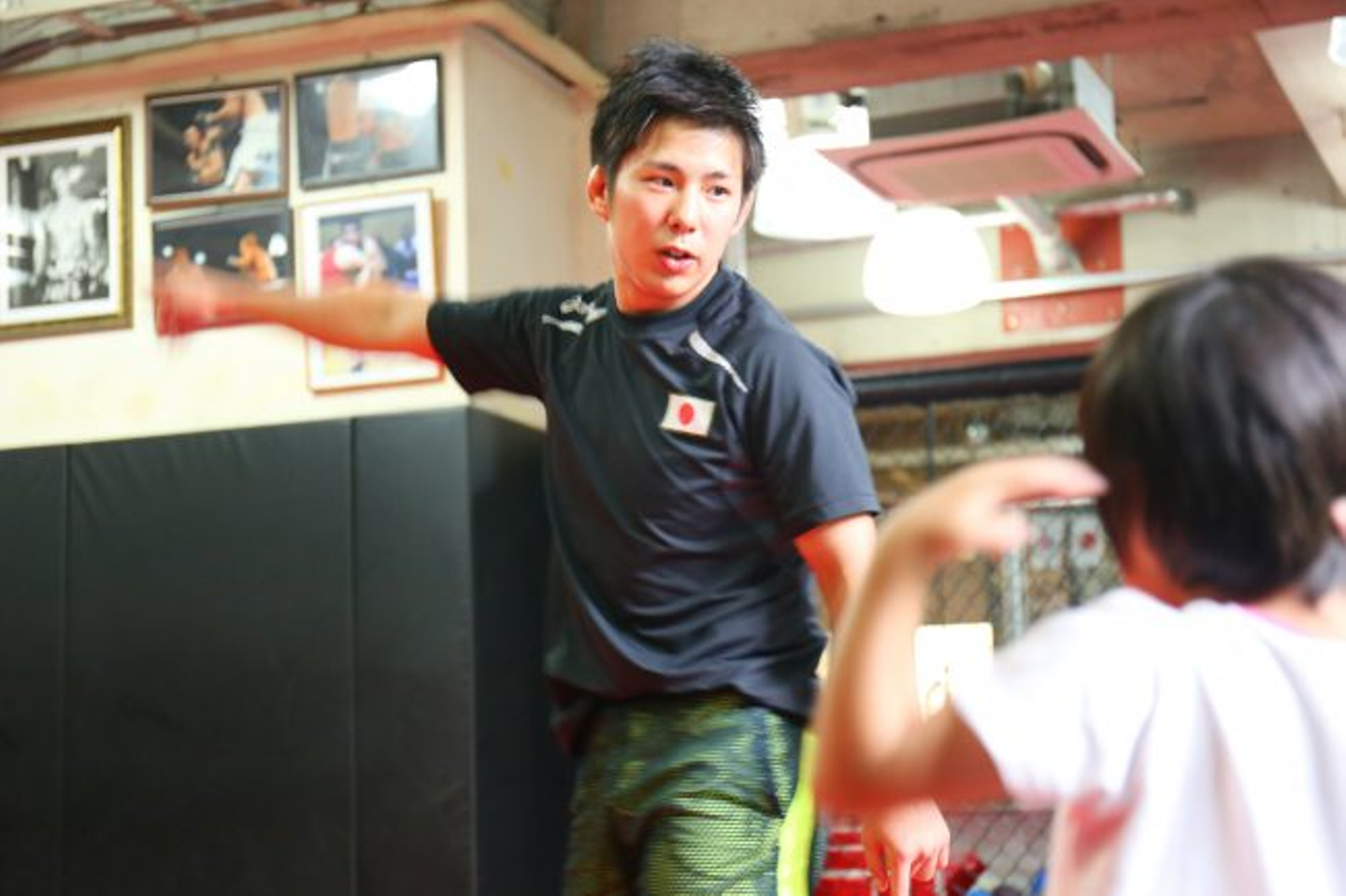 (子供にレスリングを指導する、アウスタOB圡田さん)