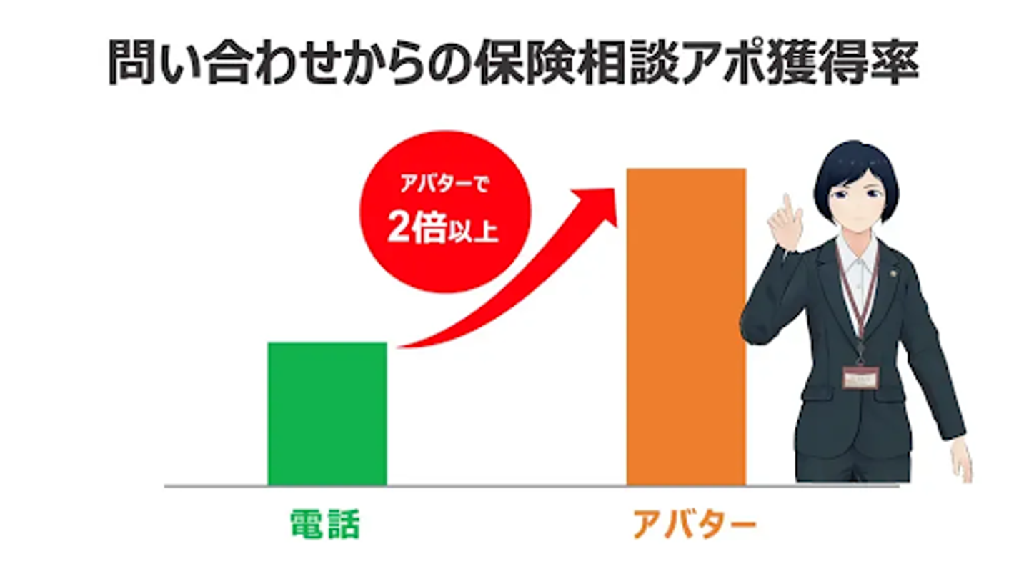 国内最大級の保険選びサイト「保険市場」にて、アバターによる問い合わせ対応や保険のコンサルティングサービスを2022年7月より開始して以降、アバターによる問い合わせからの保険相談アポ獲得率は電話に比べて2倍超の結果が出ております。また、オンライン保険相談におけるコンサルタント指名予約においてはアバターが最も選ばれているなど、生身の人間よりアバターの方が気軽に相談できるというお声も多数いただいていることなどから、保険相談を希望されているお客さまがアバターを通じたコミュニケーションを支持していただいていることを確認しております。