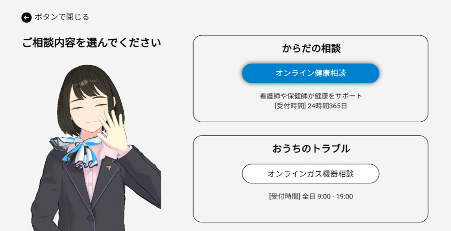 日々の健康に関する不安や疑問に対して、看護師や保健師の資格を持つカウンセラーにアバターを介して24時間365日いつでもご相談いただけます。