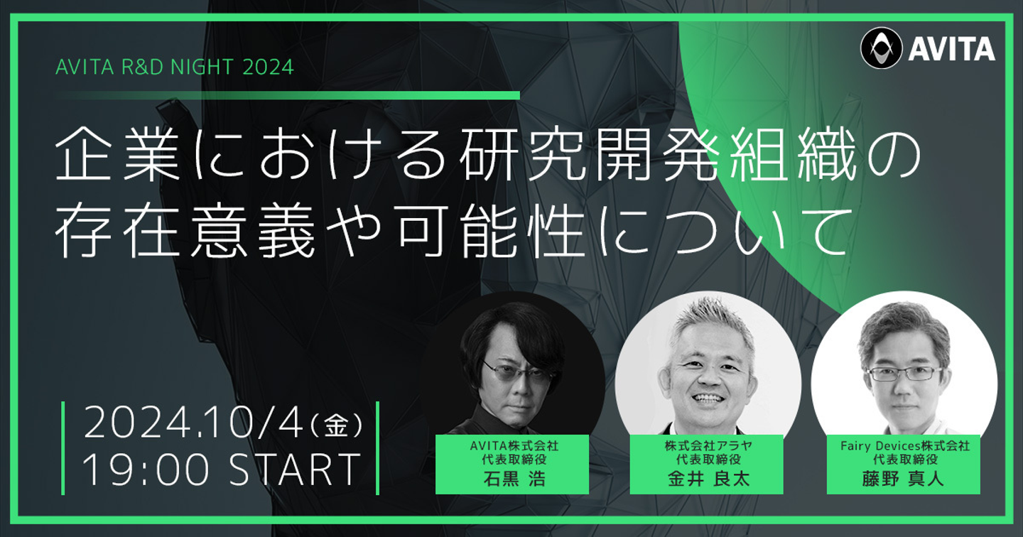 2024年10月4日(金)にAVITAの新オフィスにて、オフライン限定セミナー「AVITA R&D NIGHT 2024」を開催いたします(定員30名)。セミナーではAVITA代表取締役CEO/CTOの石黒浩、アラヤ社代表取締役CEOの金井良太氏、Fairy Devices社代表取締役CEO/CTOの藤野真人氏が「企業における研究開発組織の存在意義や可能性について」をテーマにパネルディスカッションなどを行う予定です。