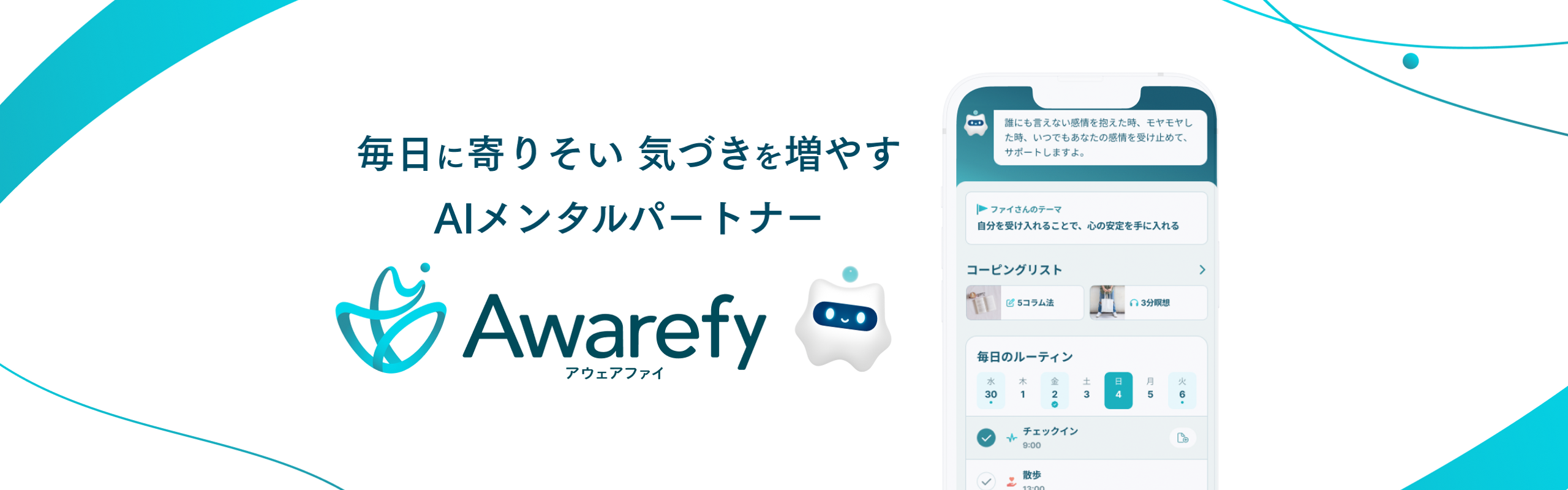 Awarefyは心の問題に取り組む会社です。私たちは最先端のAIと心理学の理論を組み合わせ、大切なことへの気づきや行動変容を促すAI メンタルパートナー「アウェアファイ」を開発・提供しています。 今後はアプリの拡大・発展はもちろん、カウンセリングや医療機関との連携をより深め、アプリと人の両面から心の健康と成長をサポートできるようなデジタル・メンタル・プラットフォームの実現を目指しています。