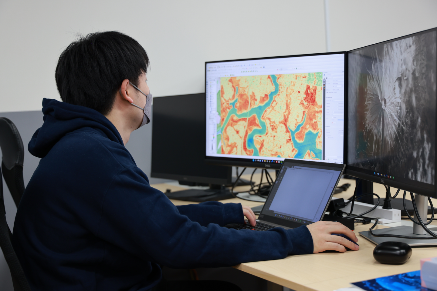 そもそもリモートセンシング(リモセン)というのは、遠く離れたところから直接触れずに対象物の詳細(大きさ・形・性質等)を観測する技術のことを指すのですが、この技術を通して、実はいろいろな技術に関わることが出来るんです。技術面では、宇宙工学はもちろん、勢いのあるデータサイエンスを含む最新技術が自分の仕事につながってくるのが面白いですし、実利用分野も農林水産業やインフラ・土木・防災など多様で、自分の全く知らない分野の方とお話しすると毎回新しい発見があって楽しいです。