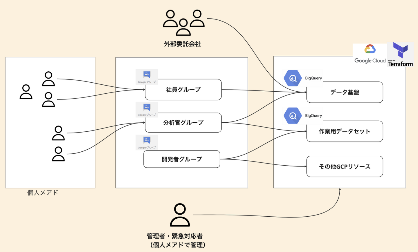 - 例えば、大半の分析官はデータレイクであるBigQueryの閲覧権限と作業環境の権限があれば十分