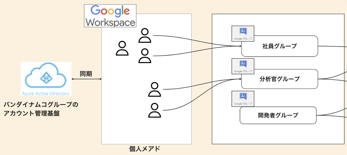 このグループをさらに有効的に活用するために情シスの方と連携しバンダイナムコグループの基幹システムであるAzure Active DirectoryとGoogle Workspaceのアカウントを同期させる取り組みも同時に行いました。