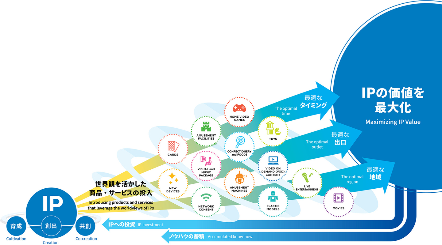 「IP軸戦略」は、エンターテインメント分野において多彩な事業領域と豊富なノウハウを持つバンダイナムコグループの強みです。 IPの世界観や特性を活かし、最適なタイミングで、最適な商品・サービスとして、最適な地域に向けて提供することにより、IP価値の最大化をはかること、それが「IP軸戦略」です。