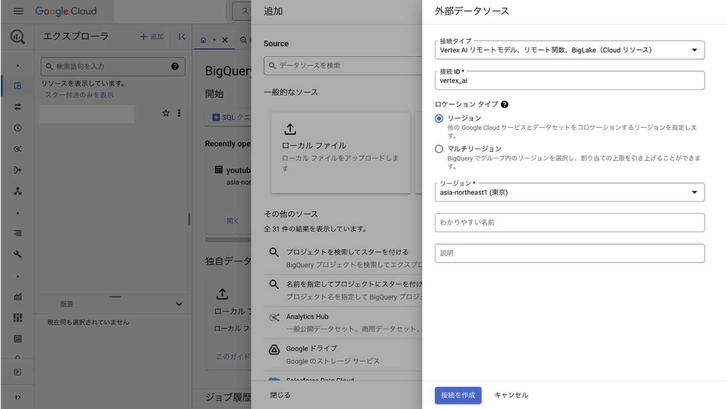 - 接続タイプ: Vertex AIリモートモデル、リモート関数、BigLake(Cloud リソース)