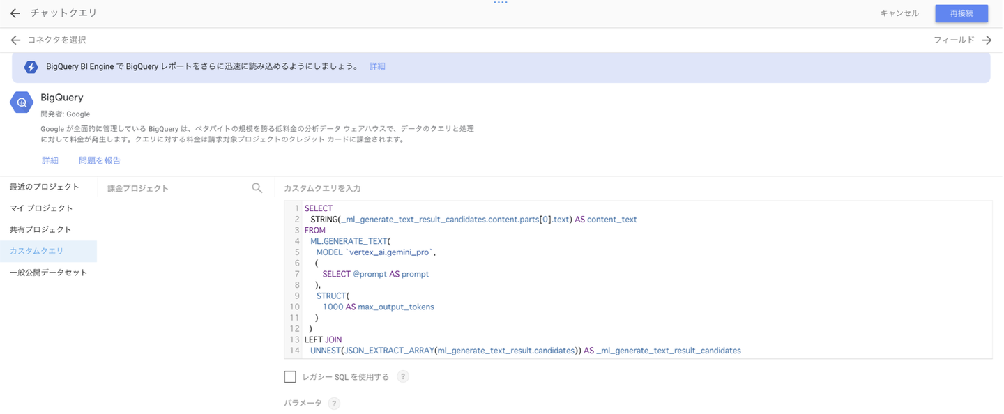 今回は細かいGemini用のパラメータまでは踏み込まないので、興味がある方はBigQuery MLの使い方を調べてみてください。
