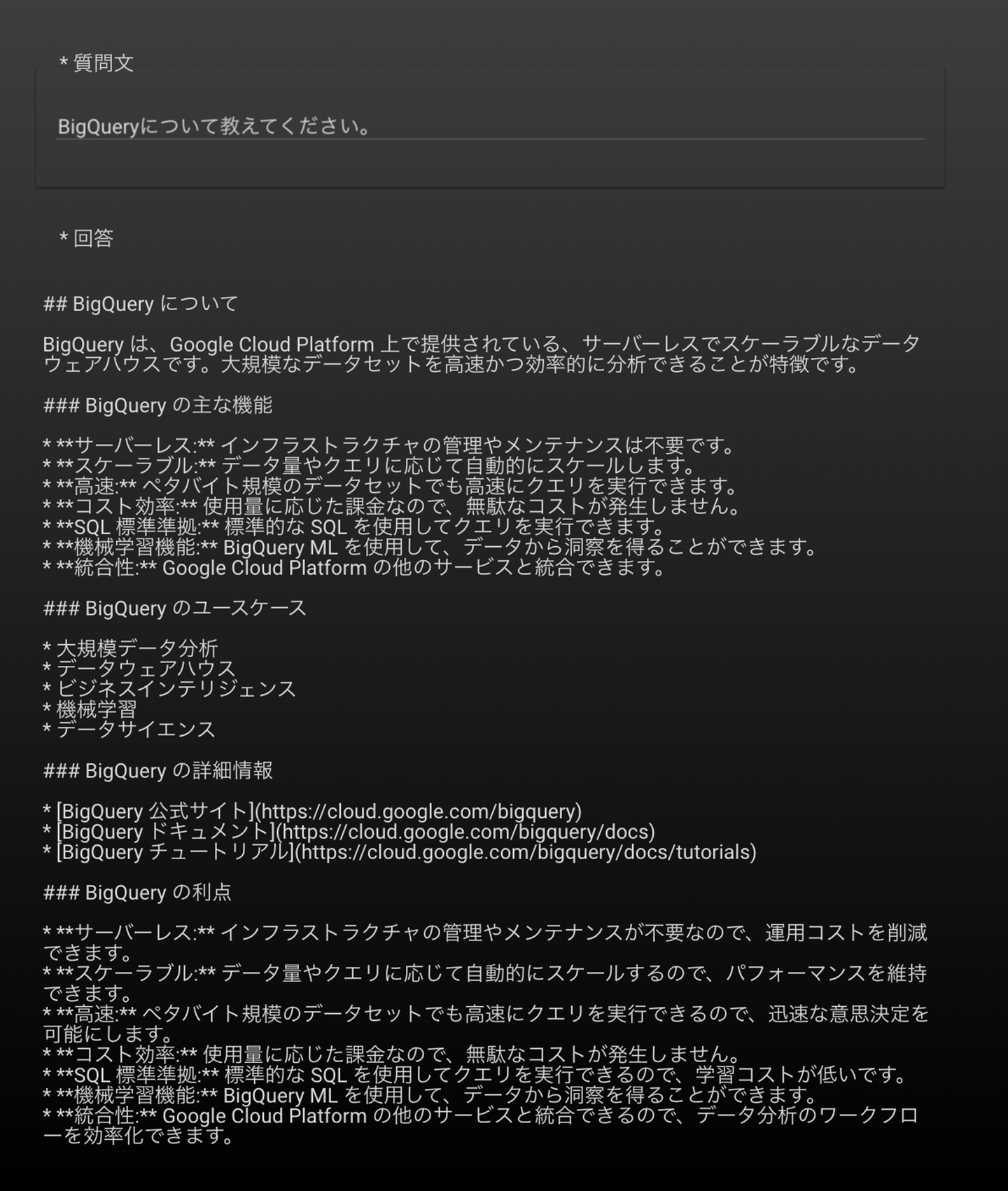LLMのモデルには2024年4月にGoogle Cloud Nextで紹介されたGemini Proモデルを使用しているため、高精度な回答が期待できます。