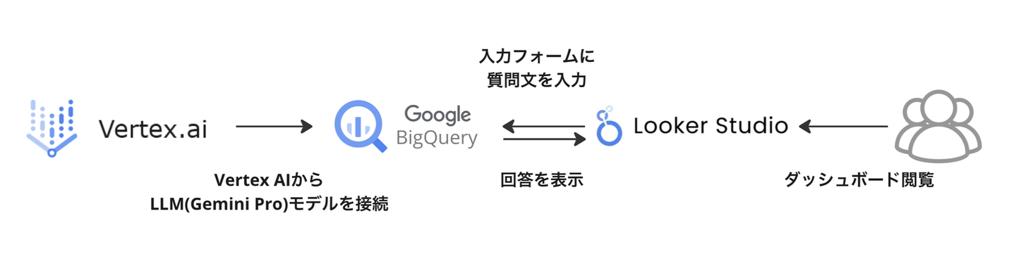 ユーザがLooker Studioで作ったチャットボットのページを開き、入力フォームに質問文を入力します。すると、裏側でBigQueryに質問文から生成したSQLが実行され、Vertex AIから接続したLLMモデルが質問文に対する回答文を生成します。その回答文がLooker Studioに返却され、ページに回答が表示されるという仕組みとなっています。