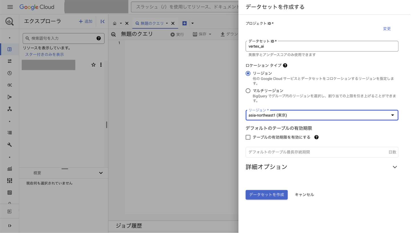 「BigQuery SQLワークスペース」を開き、プロジェクト名右のメニューより「データセットの作成」を選択してください。