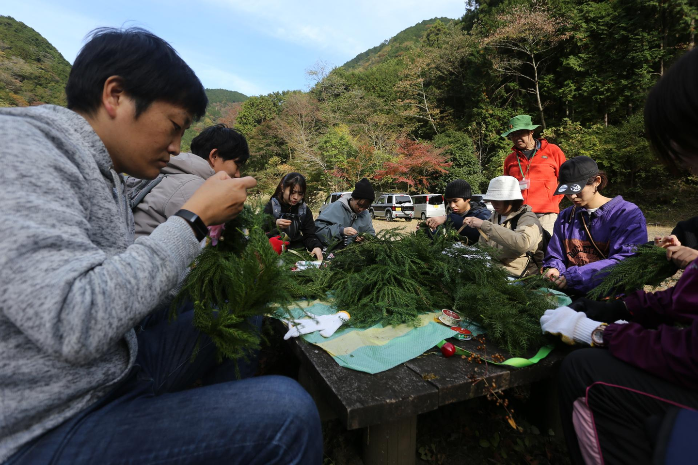 インストラクターさんが前日に伐採してくださったリースに、森に落ちている松ぼっくりなどを採集して、各々の感性のもと、仕上げていきます。