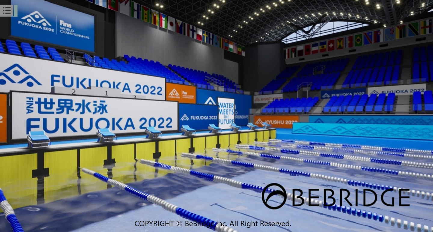 2022年5月から福岡市で開催される「第19回FINA世界水泳選手権2022福岡大会」に先立ち、株式会社ビーブリッジ(本社:東京都千代田区、代表取締役:野崎 良博)ではマリンメッセ福岡A館に設営予定のメイン会場をVRで再現。高度なVR技術により立体的かつ緻密に可視化された空間によって、これまでの平面的な画像以上にイメージを正確にお伝えすることができるようになりました。