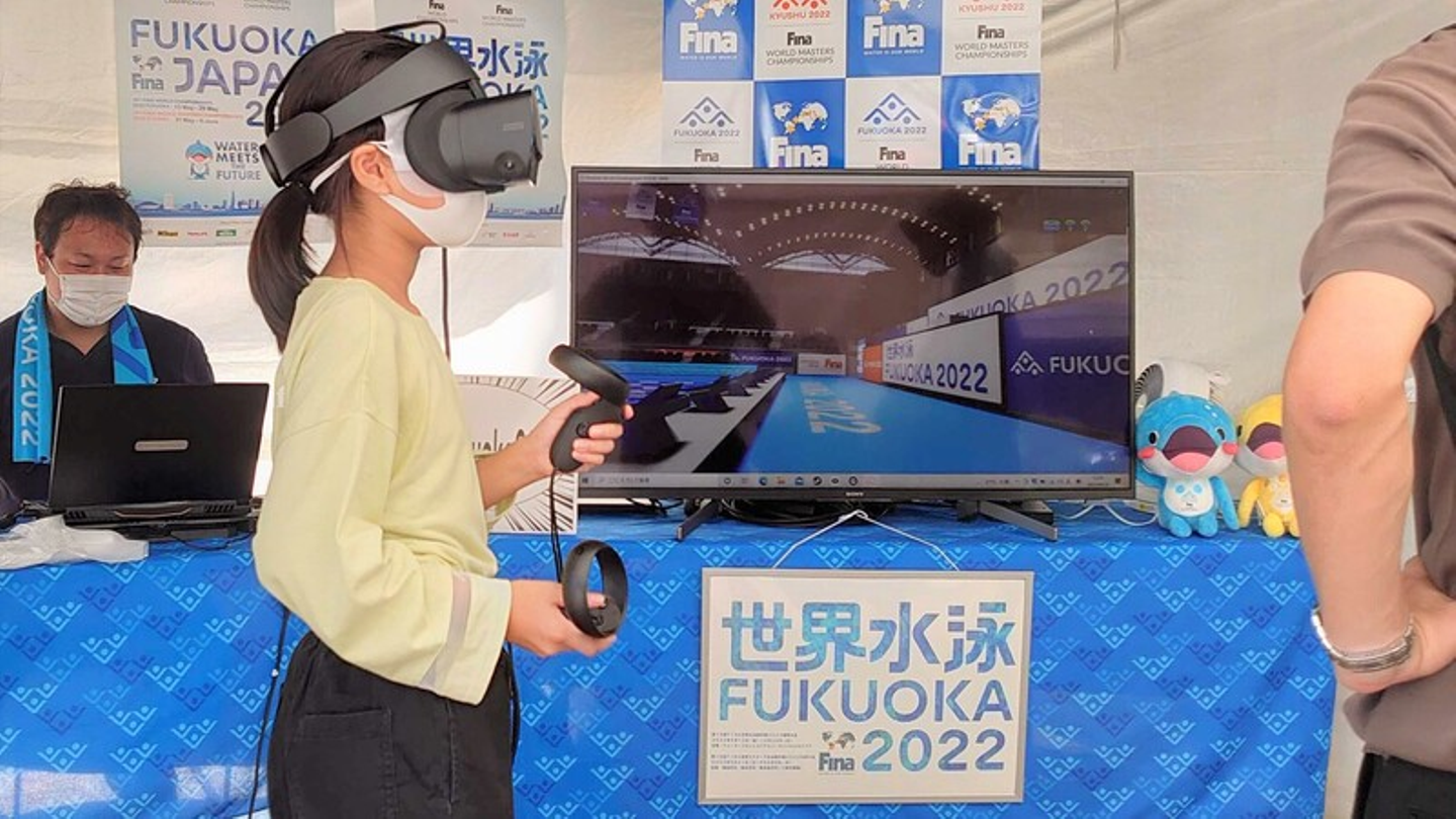 このVR会場は大会運営やプロモーションなどにも活用されており、2021年8月26日~8月29日に糸島市で開催された「Sansan KBCオーガスタゴルフトーナメント2021」内、FINA世界水泳2022福岡大会のPRブースにおいては、参加者の方々に実際に臨場感に満ちた会場体験をしていただきました。