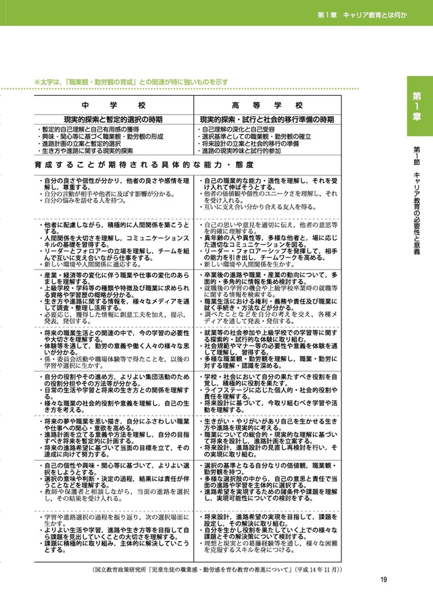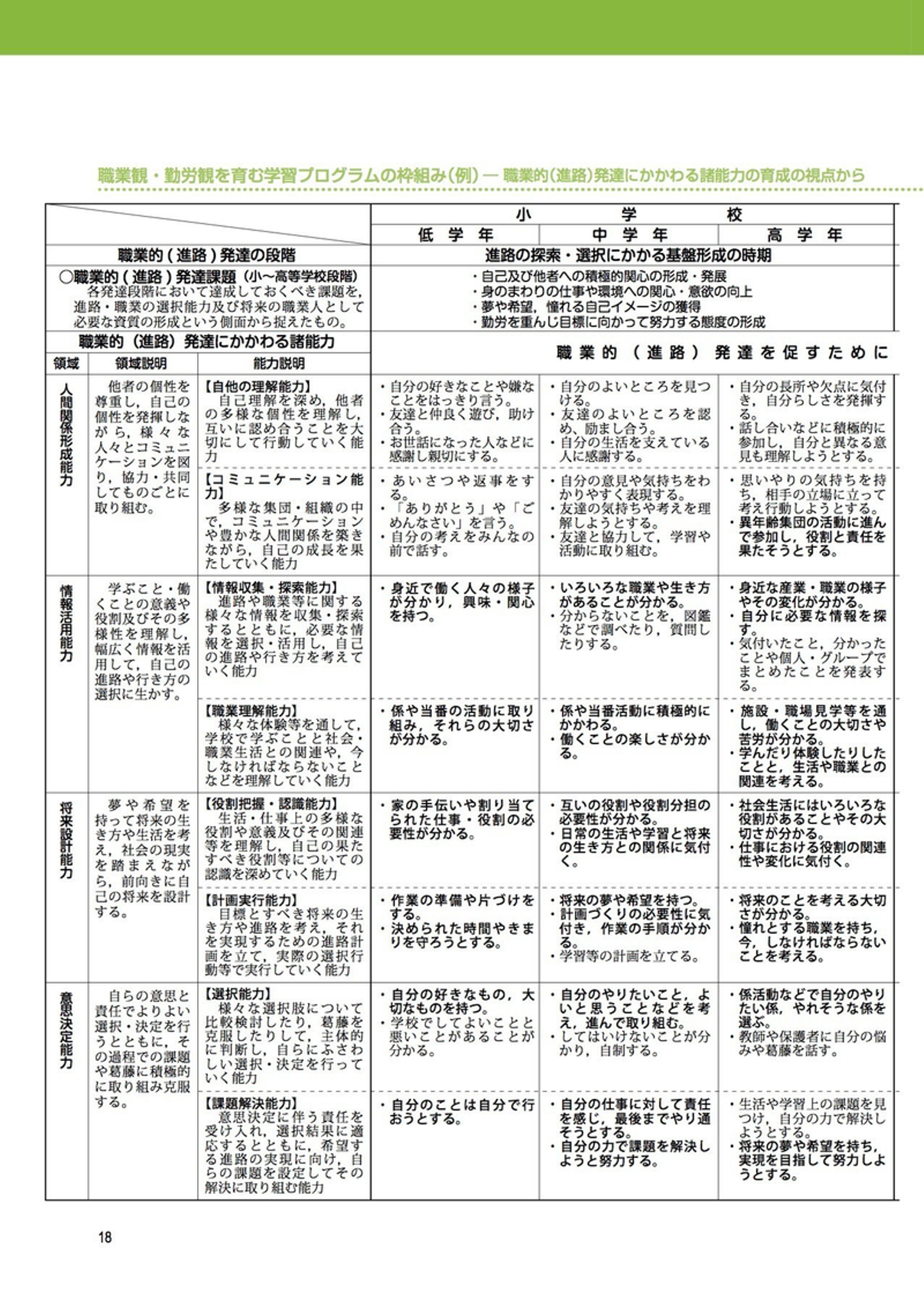 またそのためにキャリア発達を促すために必要な能力と、それらを時系列毎にどのように学校が関わるべきなのかも詳細に定められていました。