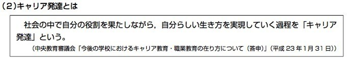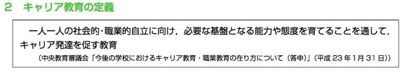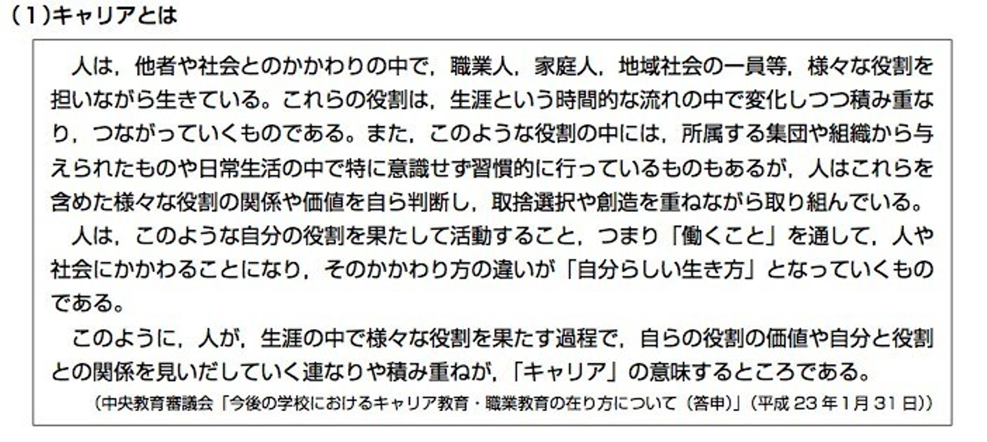1999年からキャリア教育という言葉が生まれ、そこから様々な取り組みを行なったようですが、そもそものキャリアという言葉の意味が各世代によって異なることから語弊や混乱があったようで、キャリアの定義も以下に記されています。
