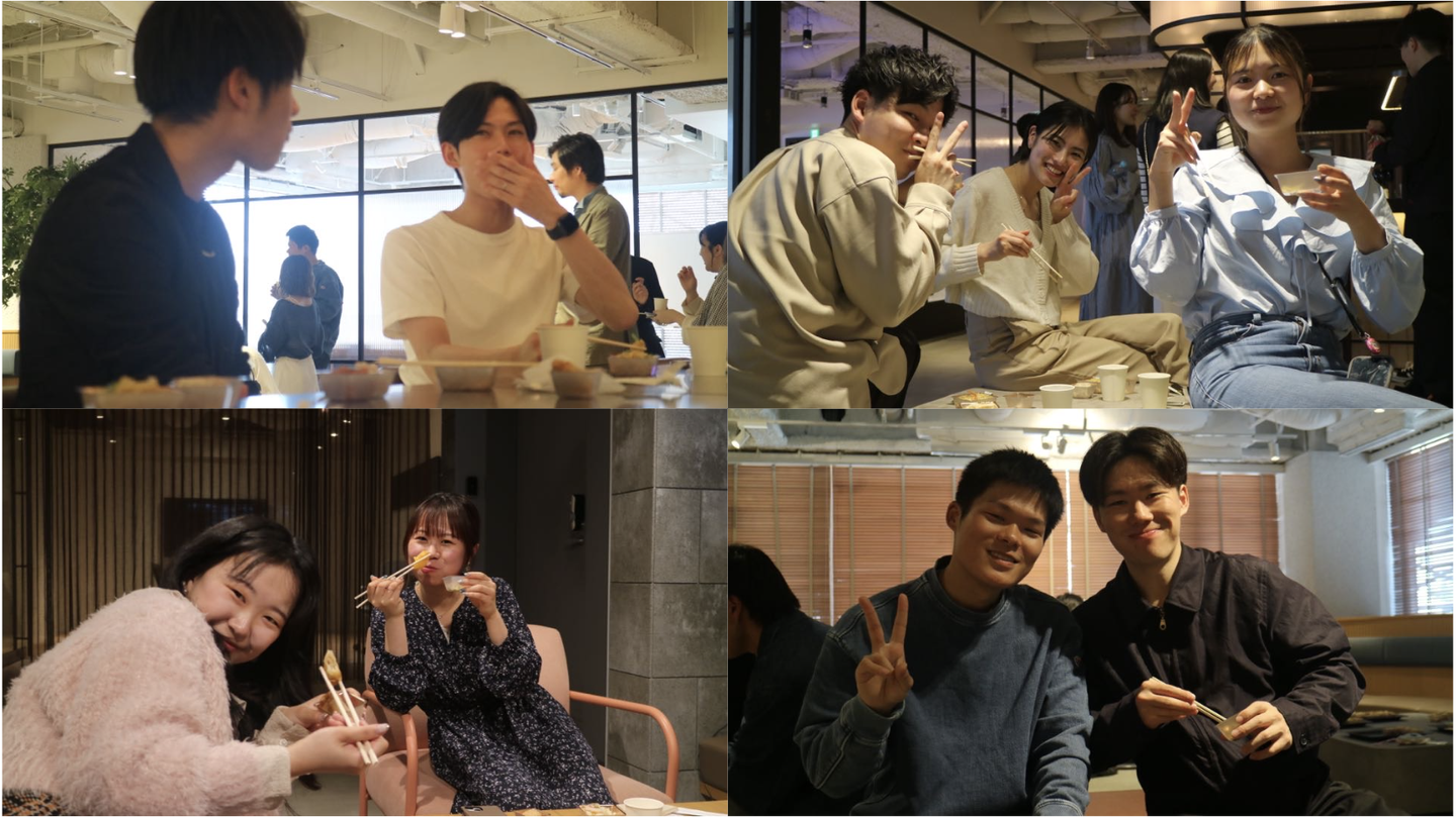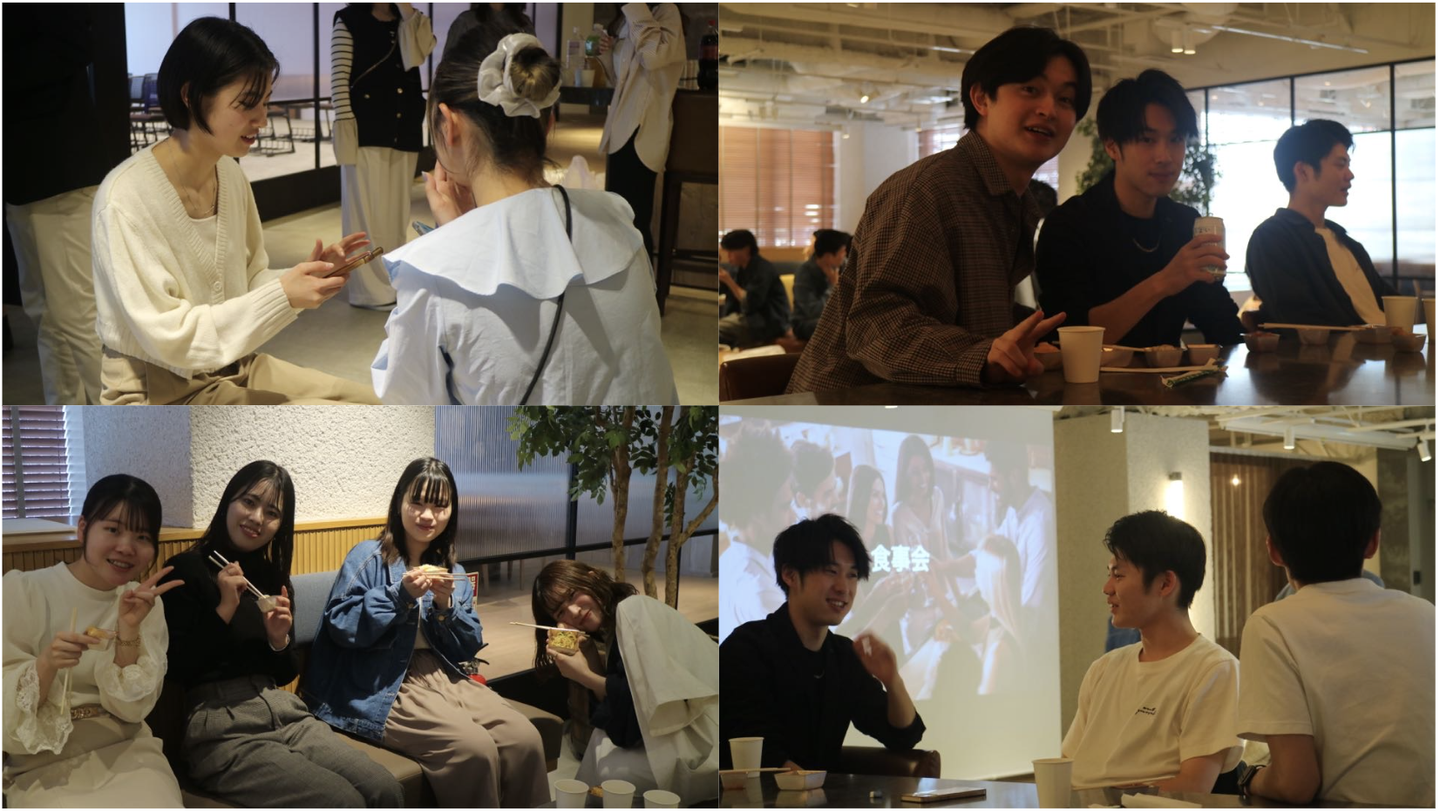 サプライズゲストを迎え、長期インターン3世代が揃ったところで、お待ちかねの食事会へ。先輩と後輩、社会人とインターンメンバー、 同期同士、たくさんのつながりが生まれ、絆の深まる時間となりました。