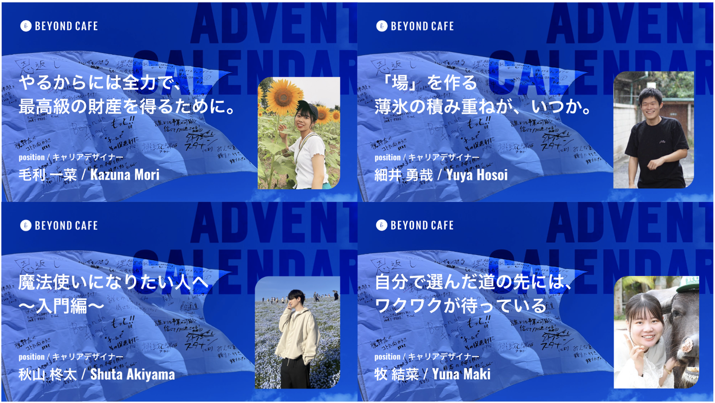 実は、3月15日より、Beyond Cafe歴代初のアドベントカレンダーを更新中です。ラストは明日、Beyond Cafe代表が飾ります!(ぜひ見てね!)