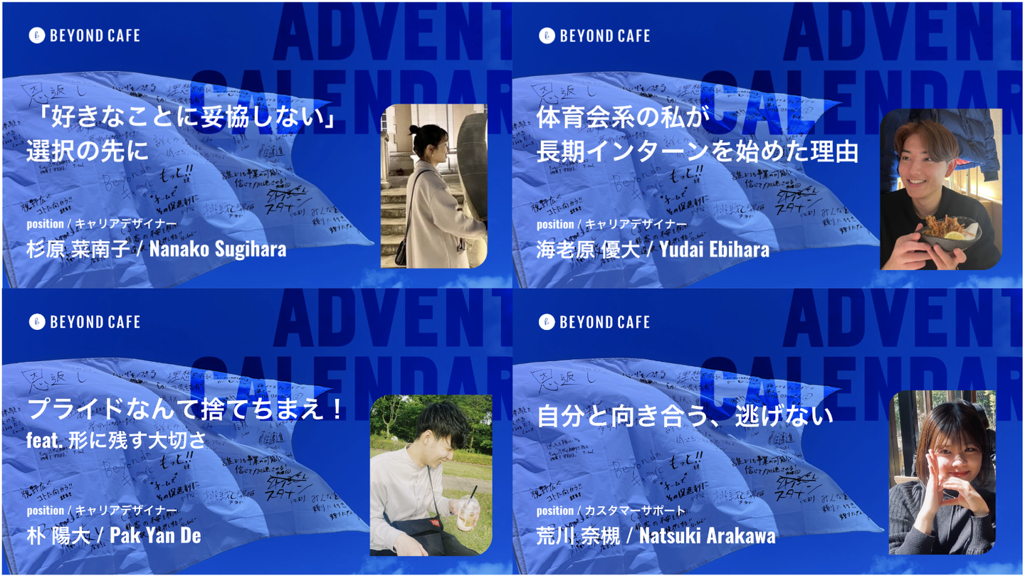 この記事は、2024年度 Beyond Cafe アドベントカレンダー1日目の記事です。こんにちは!株式会社Beyond Cafe人事 / 広報の青木です。来る3月末、第8代目の長期インターン1...