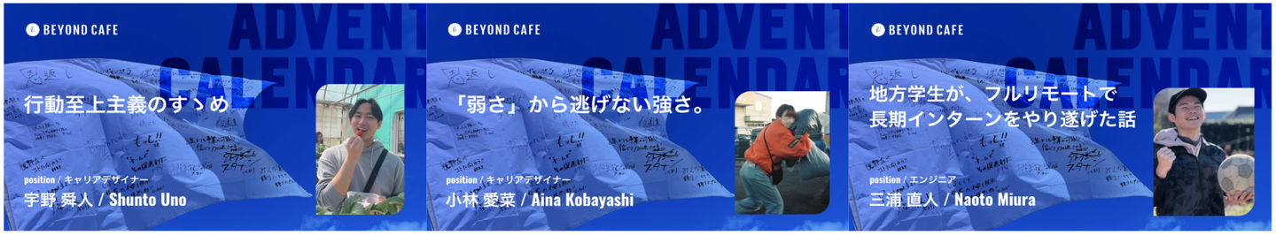 今回のアドカレは、「ありのまま」を届けることを目的に、インターンメンバー(=大学生)が自分の言葉で、等身大の自分たちを語っています。ですので、社会人が読んでも、学生さんが読んでも、誰が読んでも、ご自身に置き換えながらご覧いただける記事がひとつはあるのではないでしょうか。